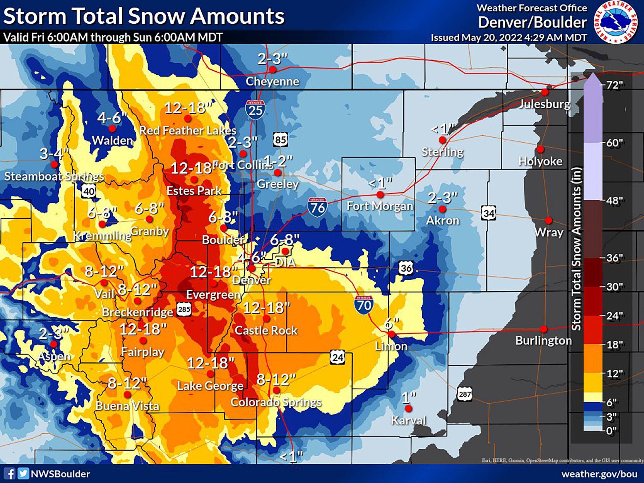 美国天气预测中心的高级分支预报员马克·切纳德(Marc Chenard)表示,周四的最高气温达到了88华氏度(31摄氏度),但第二天气温急剧下降。周五中午,丹佛气温为37华氏度,下着雨夹雪,可能会在夜间降下4到8英寸的雪。附近的科罗拉多山镇预计会有更多的降雪。