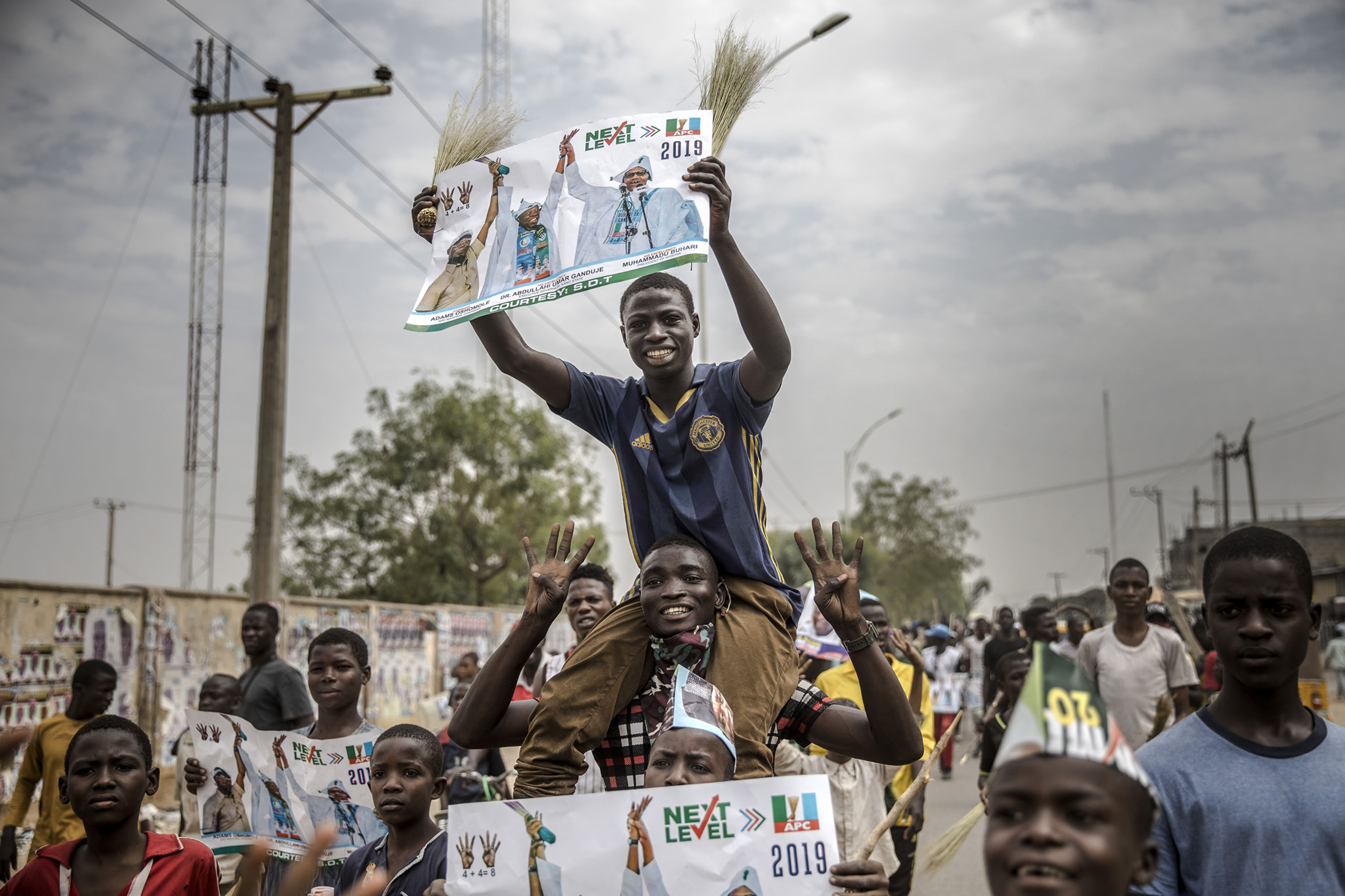 全进步大会支持者庆祝尼日利亚总统穆罕默杜·布哈里在2019年的连任。摄影师:路易斯·塔托/AFP有一些知名人物,但没有明显的领先者。