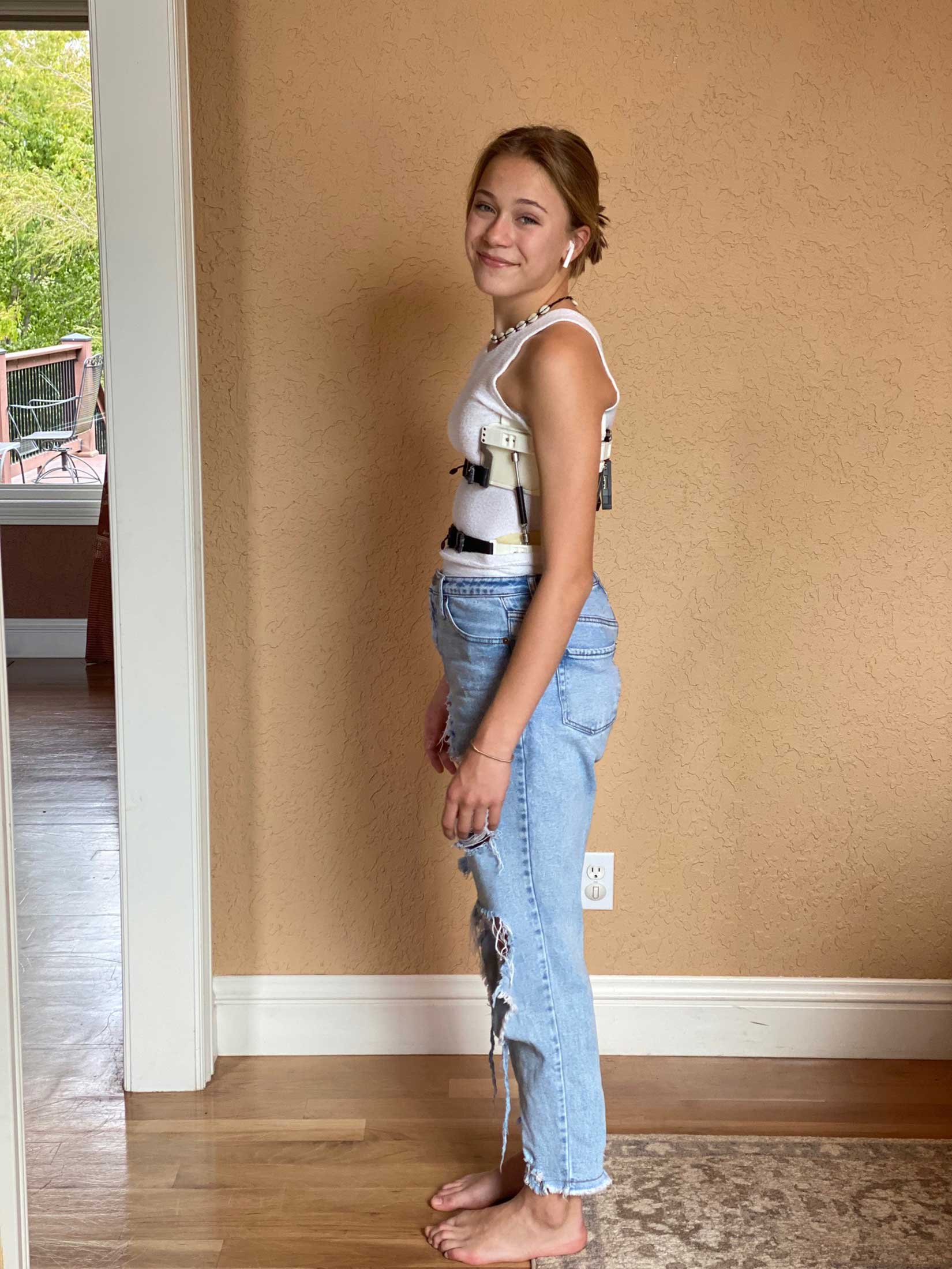 艾米·斯威尼是密苏里州卡塞奇的七年级学生,她参加排球和篮球比赛,正在学习潜水。她在7岁时被诊断出患有早发型脊柱侧弯。现在,13岁的她在壁橱里的架子上堆放着她多年来穿过的七个背部支架。