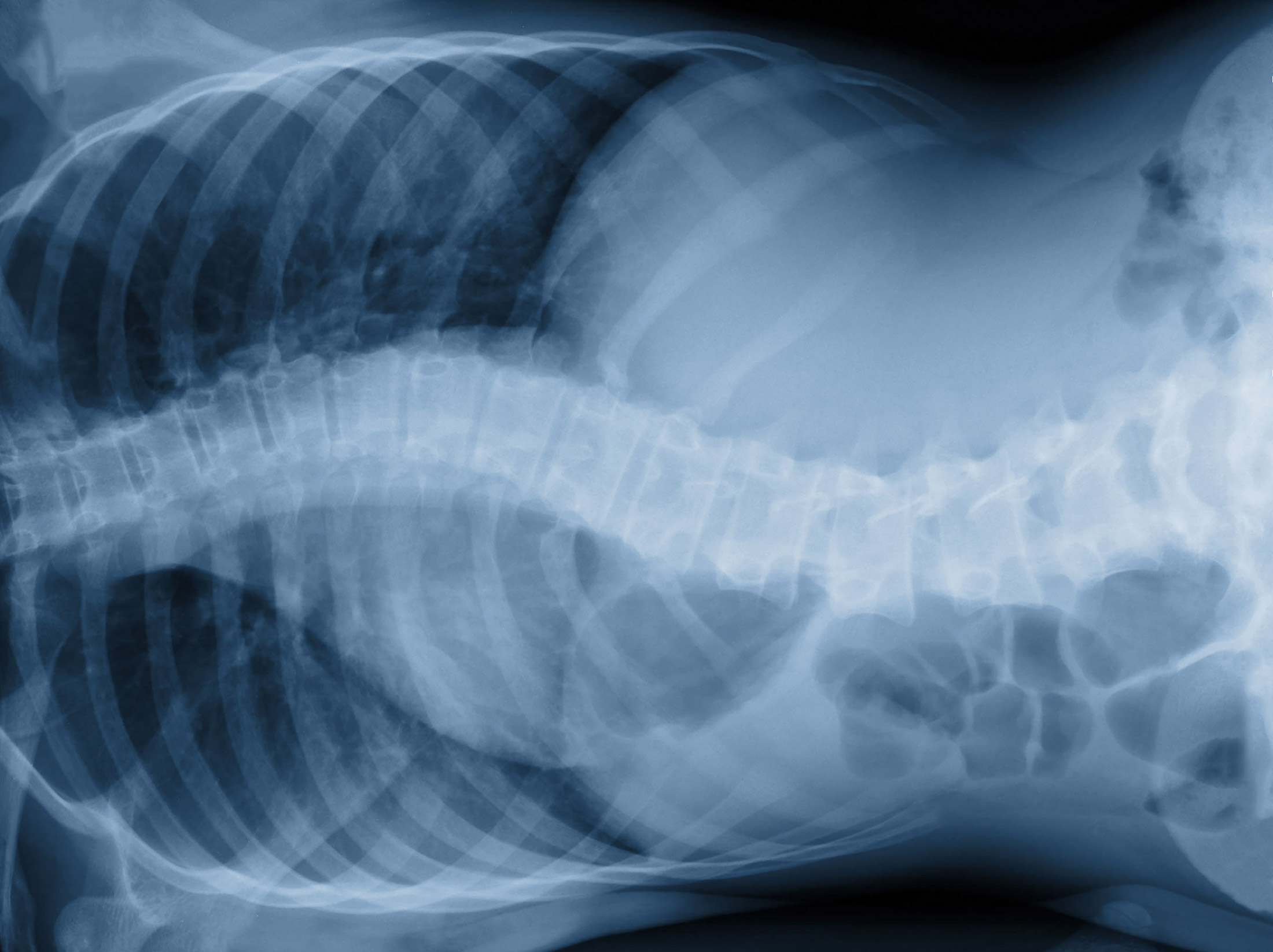 一张X光片显示了一名十几岁患者的脊柱弯曲。