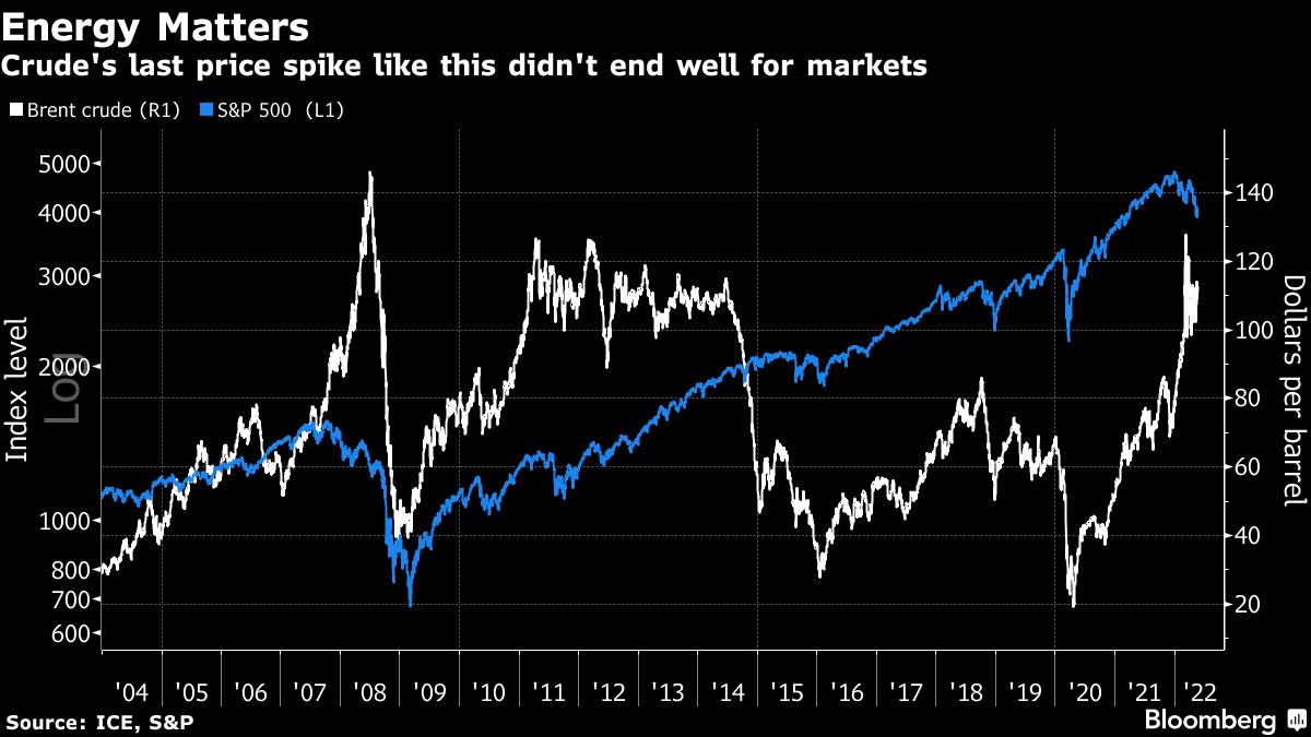 能源价格保持如此之高是经济和市场的又一大阻力。只需看看布伦特原油从2020年崩溃的低点飙升至每桶120美元以上的情况——与2008年达到接近150美元的纪录水平的涨势不相上下。当时原油价格的飙升很快被雷曼兄弟引发的股市崩盘所紧随。