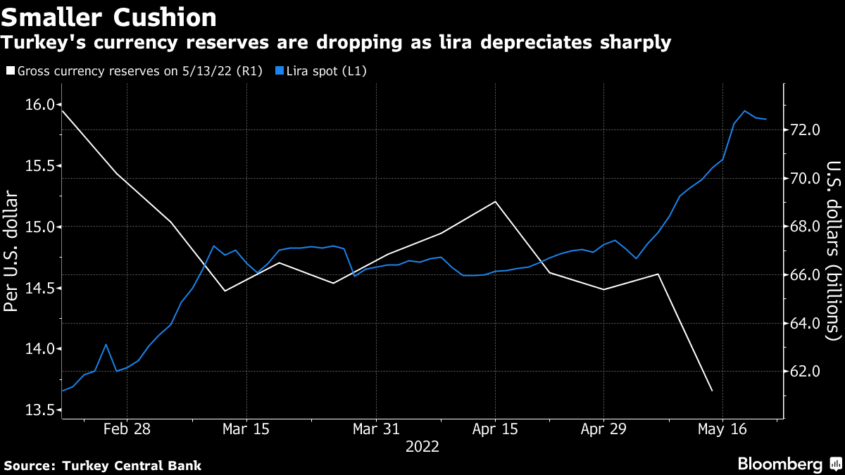 土耳其的外汇储备今年下降最多。根据央行数据,截至5月13日的七天内,外汇储备减少了48亿美元。这使得总持有量(不包括黄金储备)降至612亿美元的10个月低点。这一周的下降是“令人震惊的”,TD证券伦敦投资组合战略负责人Cristian Maggio表示,这表明土耳其“未能逆风而行”。