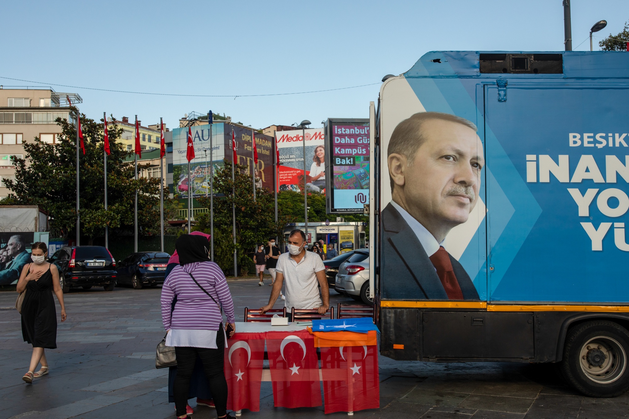 一辆标有土耳其总统雷杰普·塔伊普·埃尔多安形象的竞选卡车。(摄影师:Nicole Tung/Bloomberg)
