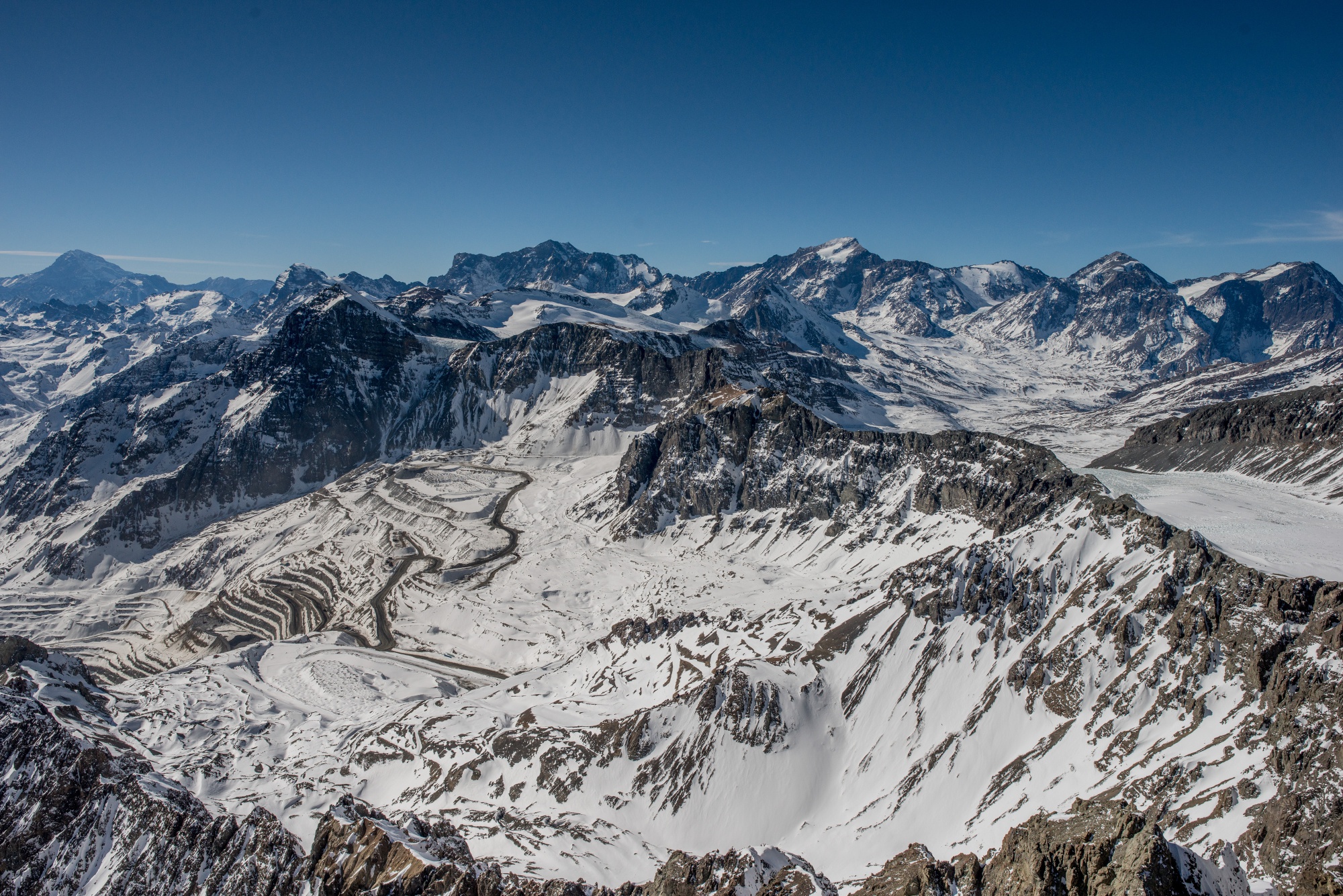 智利圣地亚哥附近安第斯山脉的安迪纳铜矿和奥利瓦雷斯阿尔法冰川,2019年。