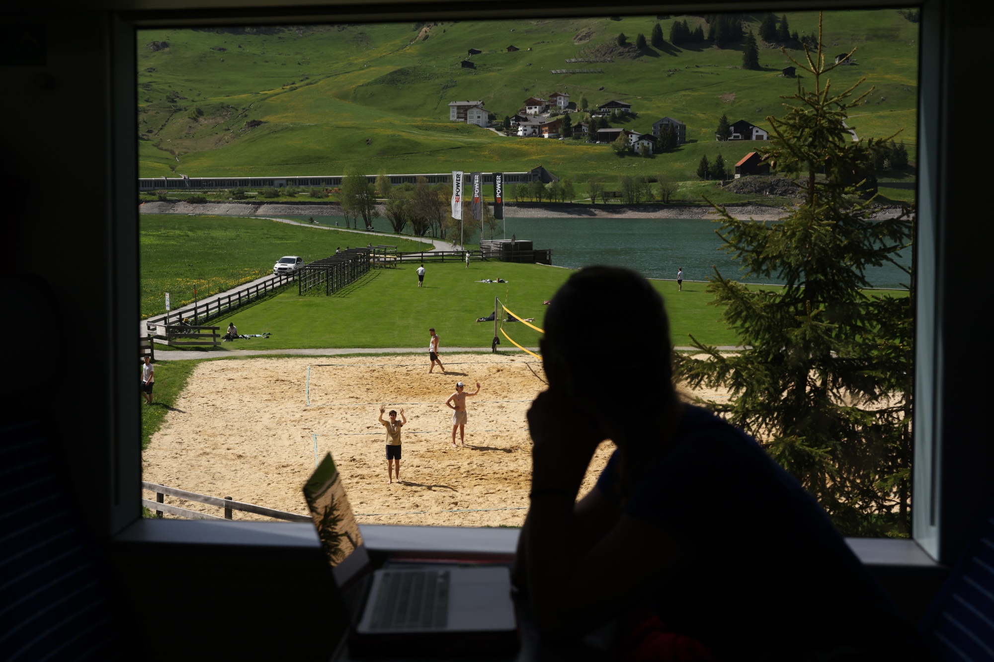 在达沃斯玩沙滩排球的人们。摄影师:Hollie Adams/Bloomberg### 您可以使用的解释