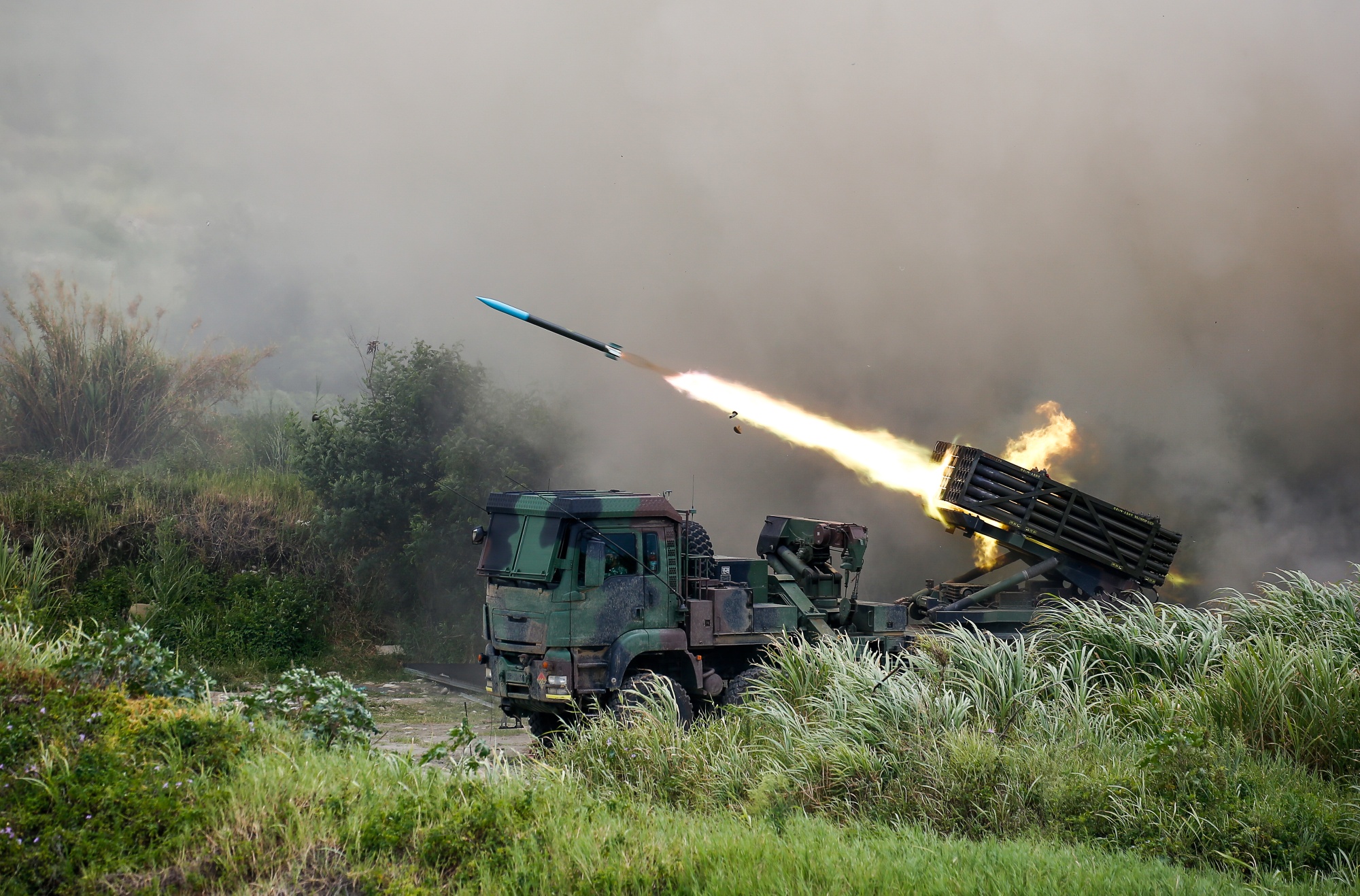 一架雷霆2000多管火箭发射器在2020年7月16日的台湾台中举行的中华民国军队年度“汉光”军事演习中发射弹药。