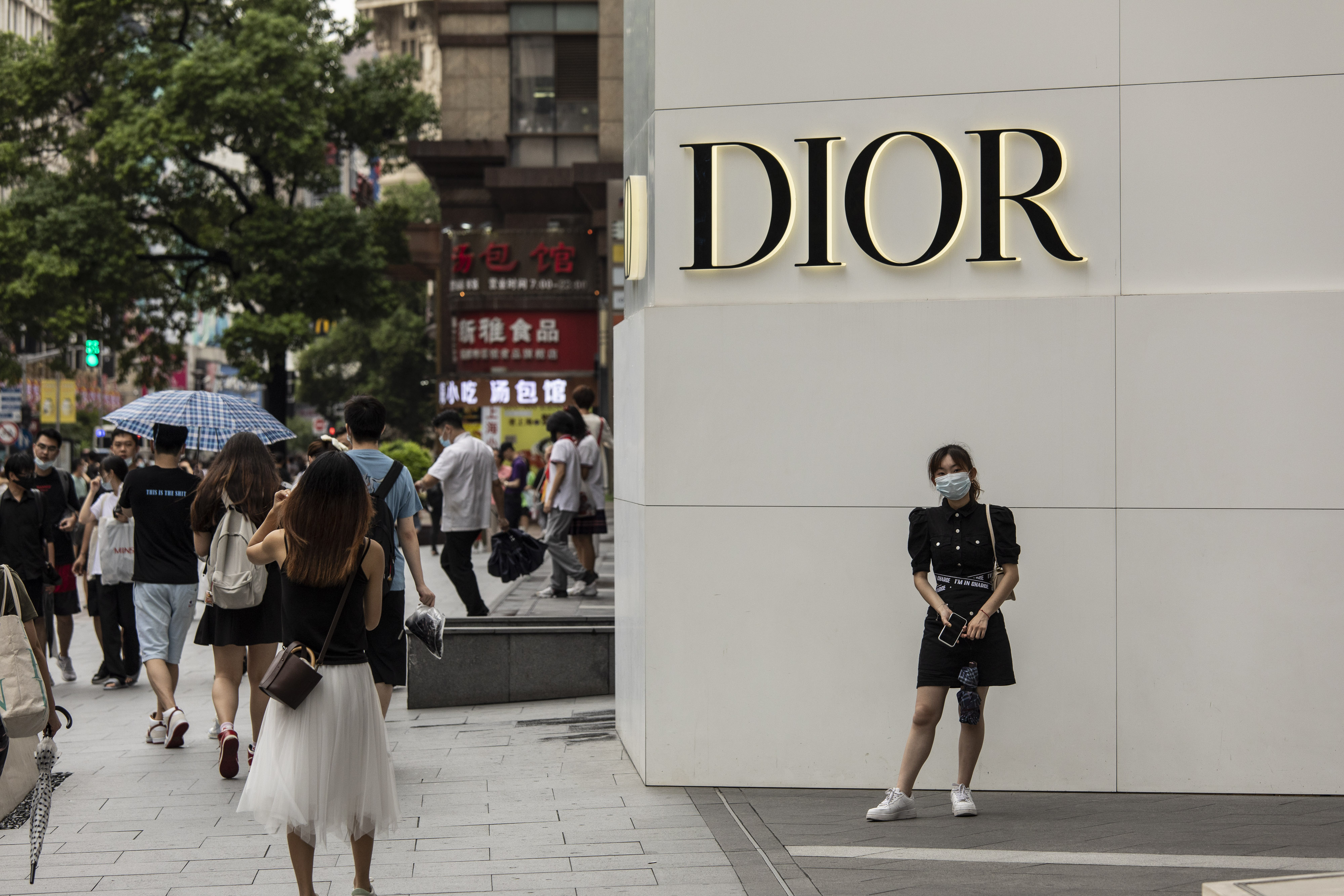 一名戴着口罩的女士站在迪奥标志下。摄影师:祁来申/彭博社### 你应该阅读的内容