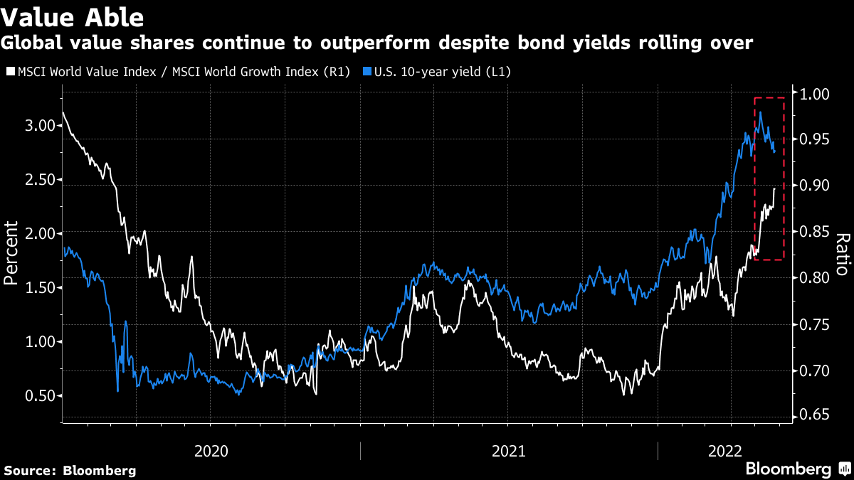 世界价值股似乎没有注意到债券收益率已经回落的事实。尽管最近10年期国债收益率 —— 全球债券基准 —— 下滑,但MSCI世界价值指数继续胜过其成长对手,本周攀升至两年多来的相对高点。上升的债券收益率往往有利于经济敏感型股票,因此对它们的回落缺乏反应,尤其是在全球经济衰退担忧的情况下,乍看之下似乎不寻常。但将通货膨胀考虑进来,以及经济增长放缓演变为滞涨的可能性,这就更有道理了。