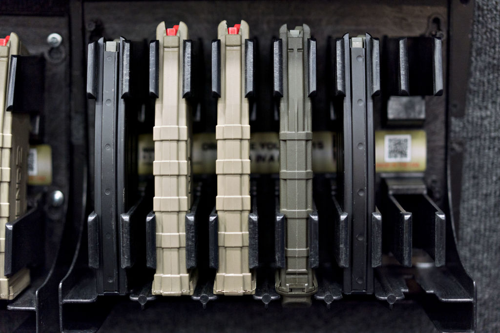 步枪弹匣摆放在2018年达拉斯全国步枪协会年会的一个展台上。摄影师:彭博社