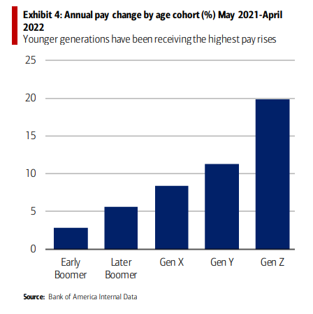 根据美国银行的研究,年轻的美国工作者和低收入者从“火热”的劳动力市场中受益最多,研究基于其自身的内部数据。