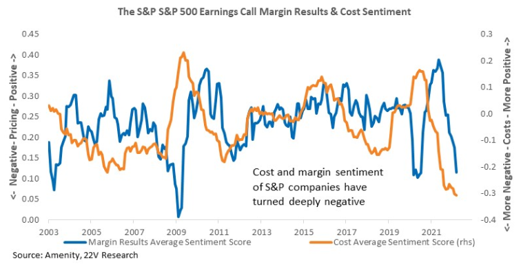 - 根据22V Research的创始人Dennis Debusschere及其团队在周三的一份报告中写道,对标准普尔500家公司的盈利电话会议的分析显示,“定价能力情绪仍然处于非常高的水平,但在过去几个季度有所下降。”