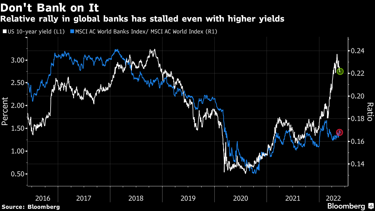 今年,全球价值关键领域之一——银行的投资者未能从更高的债券收益中获得应有的回报。今年早些时候,全球银行股票的MSCI指数相对表现脱离了与10年期国债收益率——全球债券基准——的紧密关系,至少在过去五年中一直紧密跟踪它们。银行相对于更广泛市场的峰值出现在俄罗斯入侵乌克兰的前一天,这表明对于增长的担忧是这一变化背后的原因。