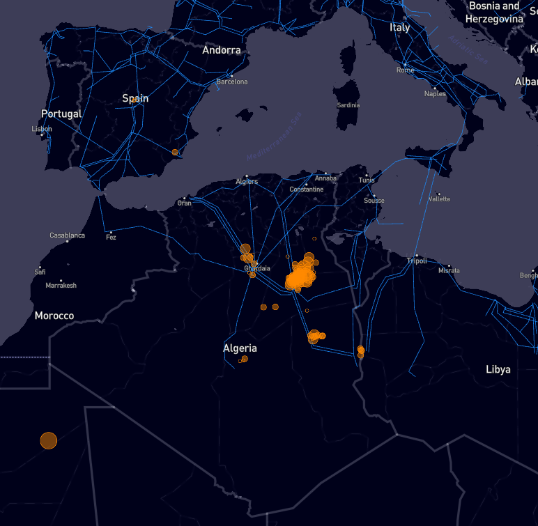 自2019年以来,卫星在阿尔及利亚上空观测到的甲烷云。
