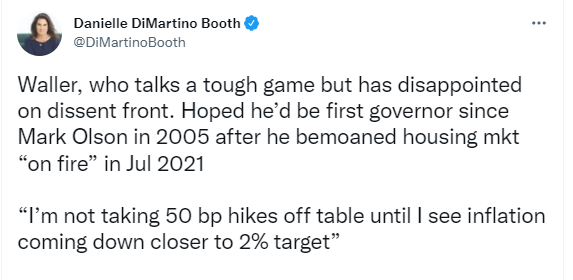 - 美联储信号 | 美联储理事克里斯托弗·沃勒表示,他希望继续以半个百分点的步伐提高利率,直到通货膨胀开始回落至美国央行的目标水平。