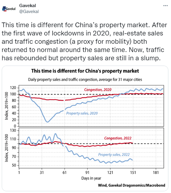 2020年的另一个对比是房地产行业持续疲软,正如研究公司Gavekal在这条推文中所指出的: