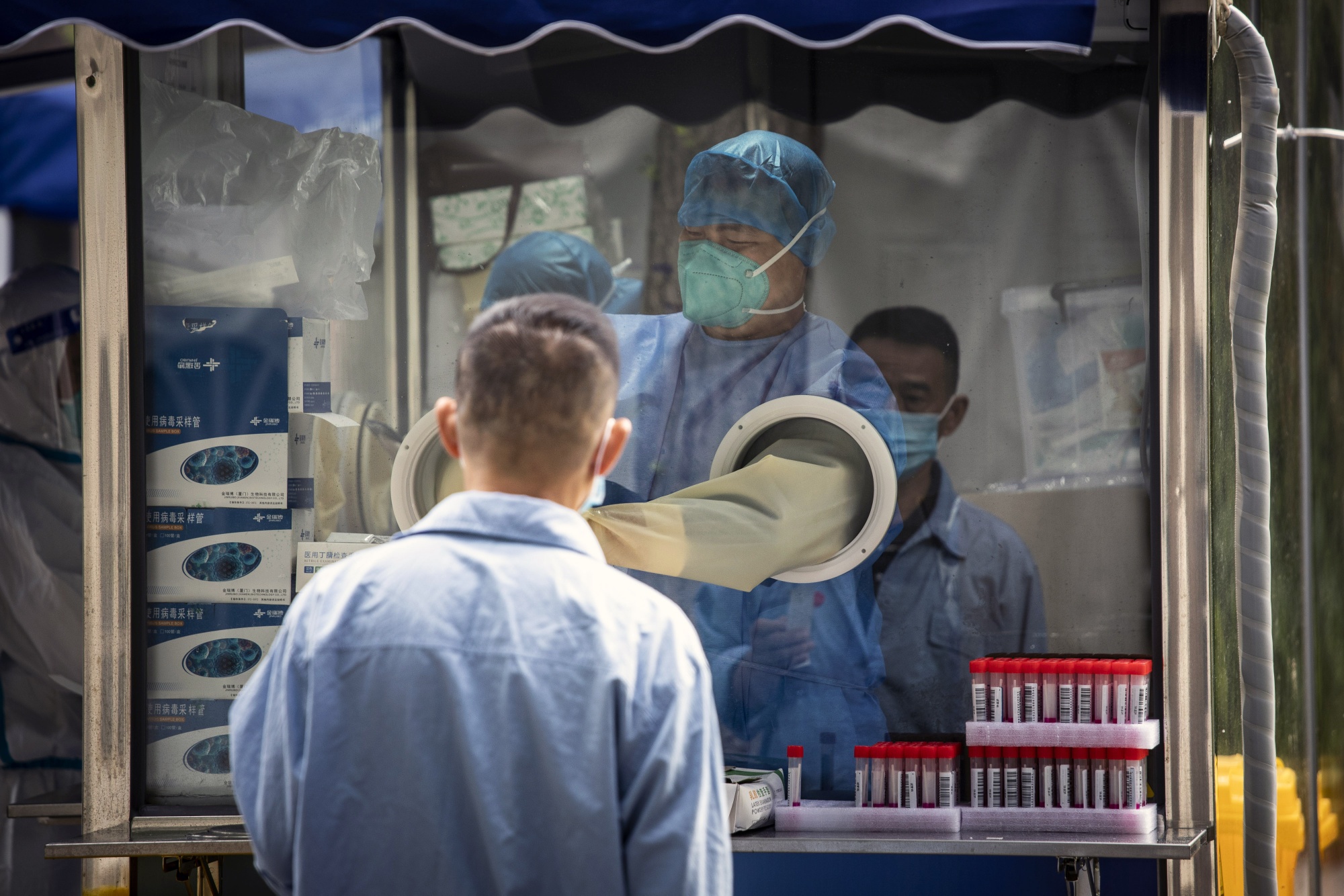 一名医护人员在上海的一家新冠病毒检测中心采集拭子样本,时间为5月31日。
