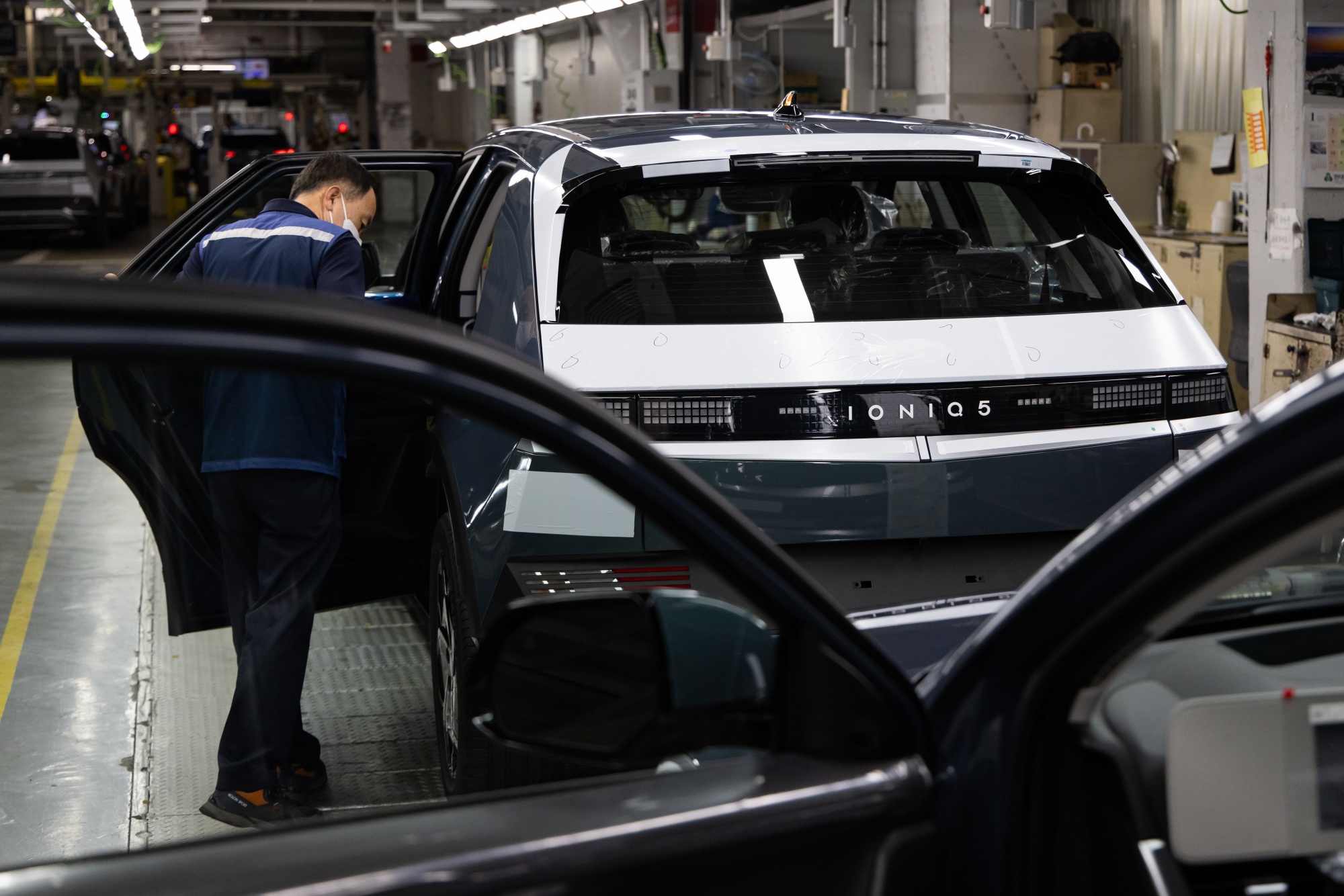 一名员工在位于蔚山的公司工厂检查现代Ioniq 5电动汽车。