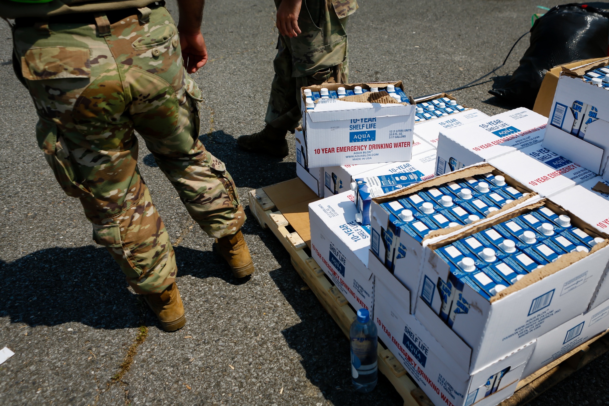 国民警卫队成员在飓风艾达过后的新奥尔良路易斯安那州一个分发中心旁边的水箱旁边。