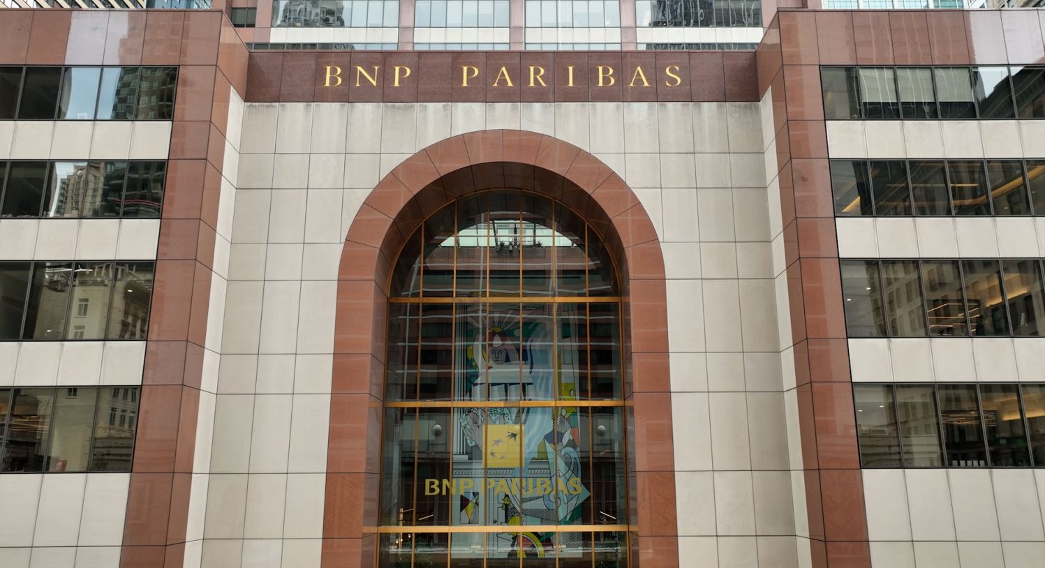 巴黎银行BNP巴黎在纽约市前Axa Equitable大厦上的名字。摄影师:盖伊·帕顿/迈克·梅普斯