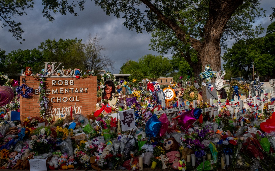 德克萨斯州乌瓦尔迪的罗布小学外的纪念物,日期为6月1日。