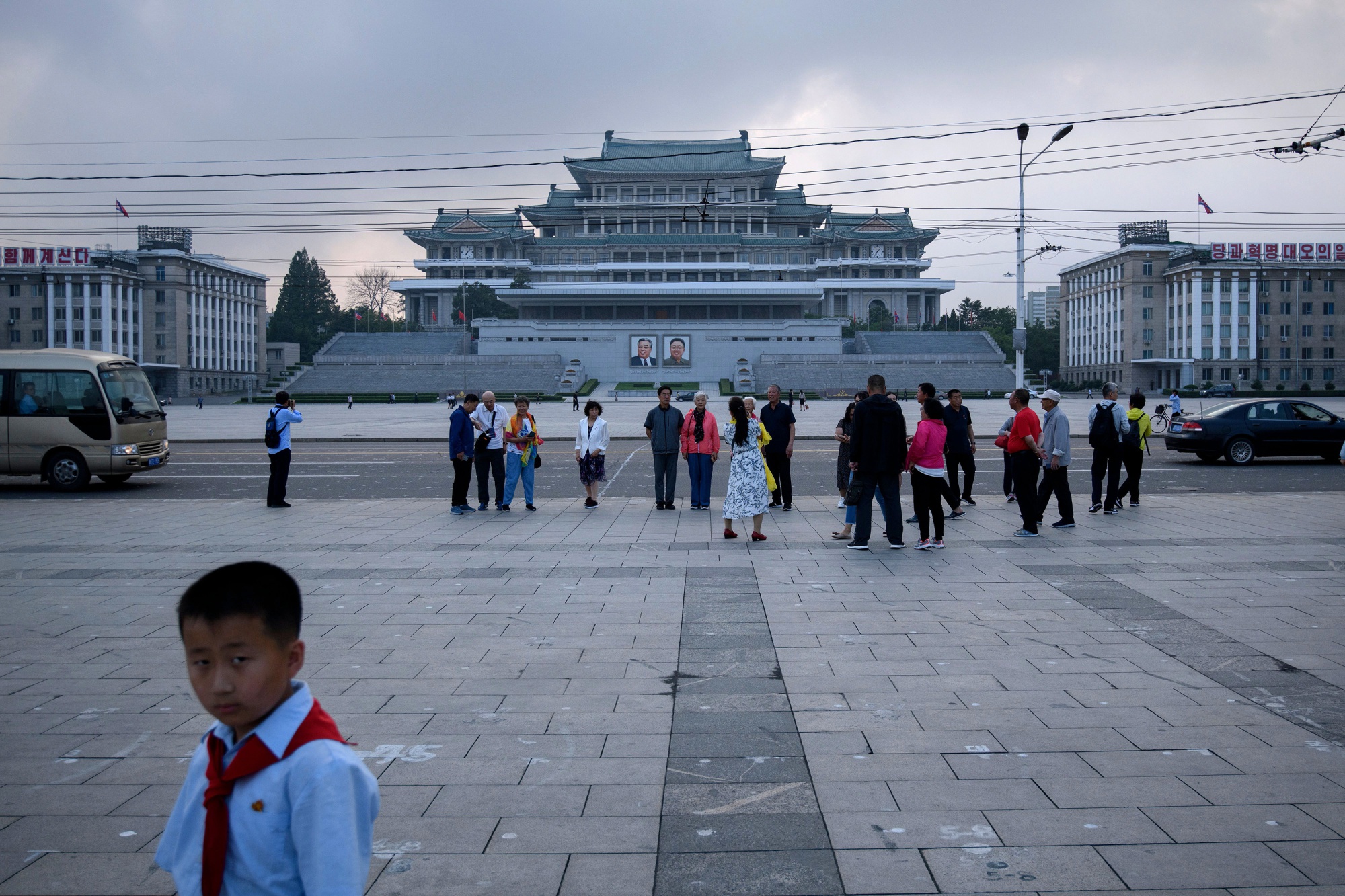 一个男孩站在平壤的金日成广场上,面对着中国游客为他拍照。