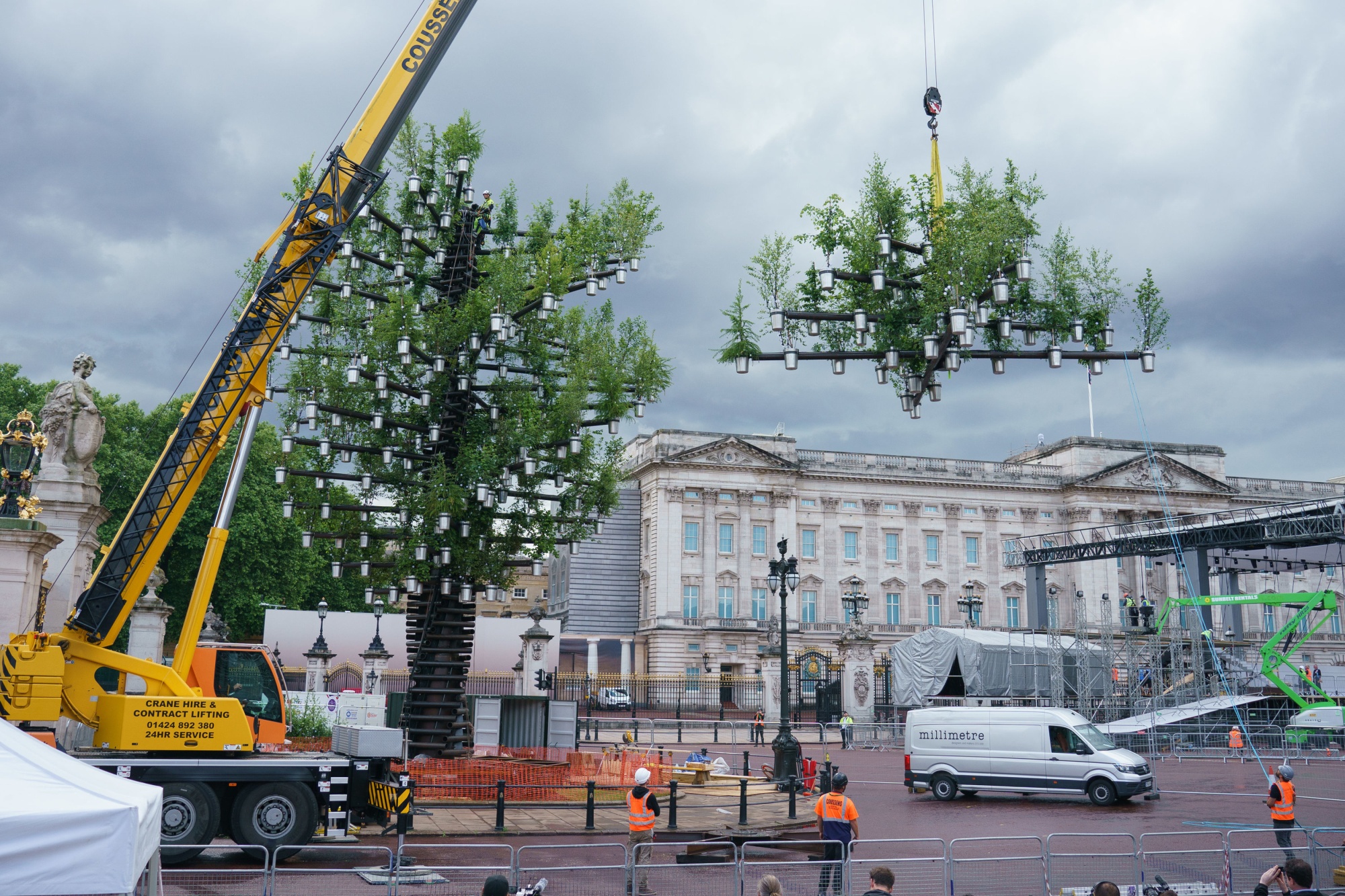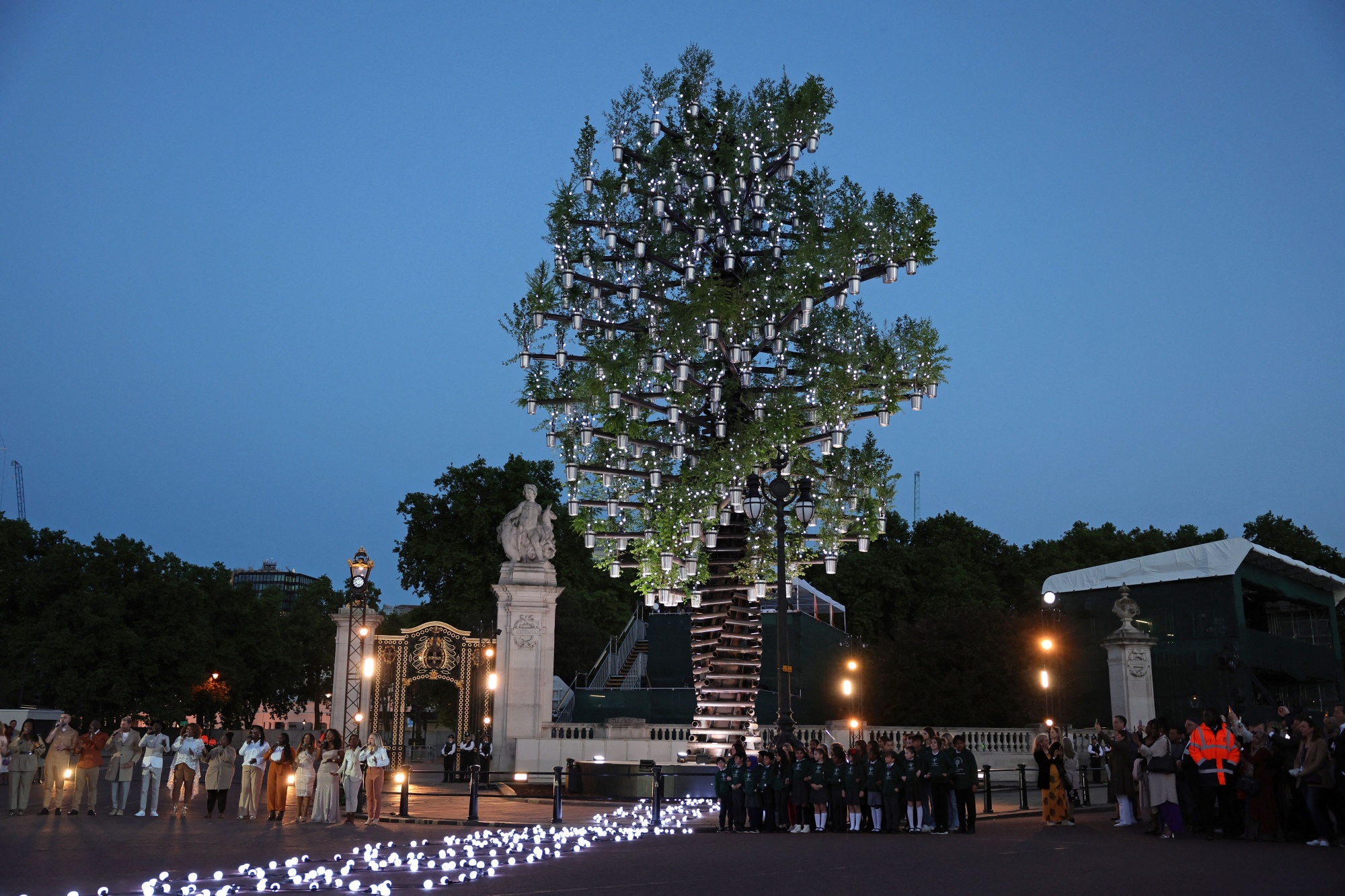 “树之树”在2022年6月2日伦敦白金汉宫点亮主灯塔的特别仪式前展示,作为女王白金周年庆典的一部分。