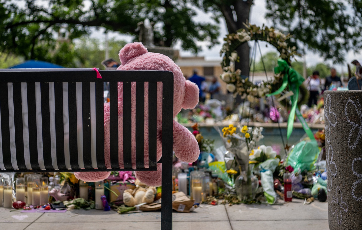在德克萨斯州乌瓦尔迪的罗布小学,一个纪念碑上放着一只泰迪熊,这是为了纪念5月24日在大规模枪击事件中被谋杀的人们
