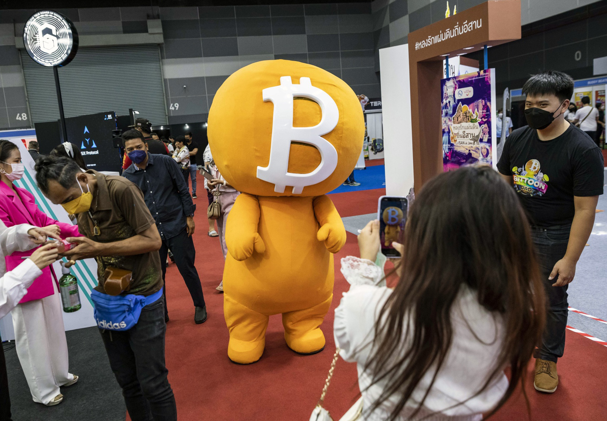 比特币吉祥物在曼谷举办的2022年泰国加密货币博览会上摆姿势拍照。