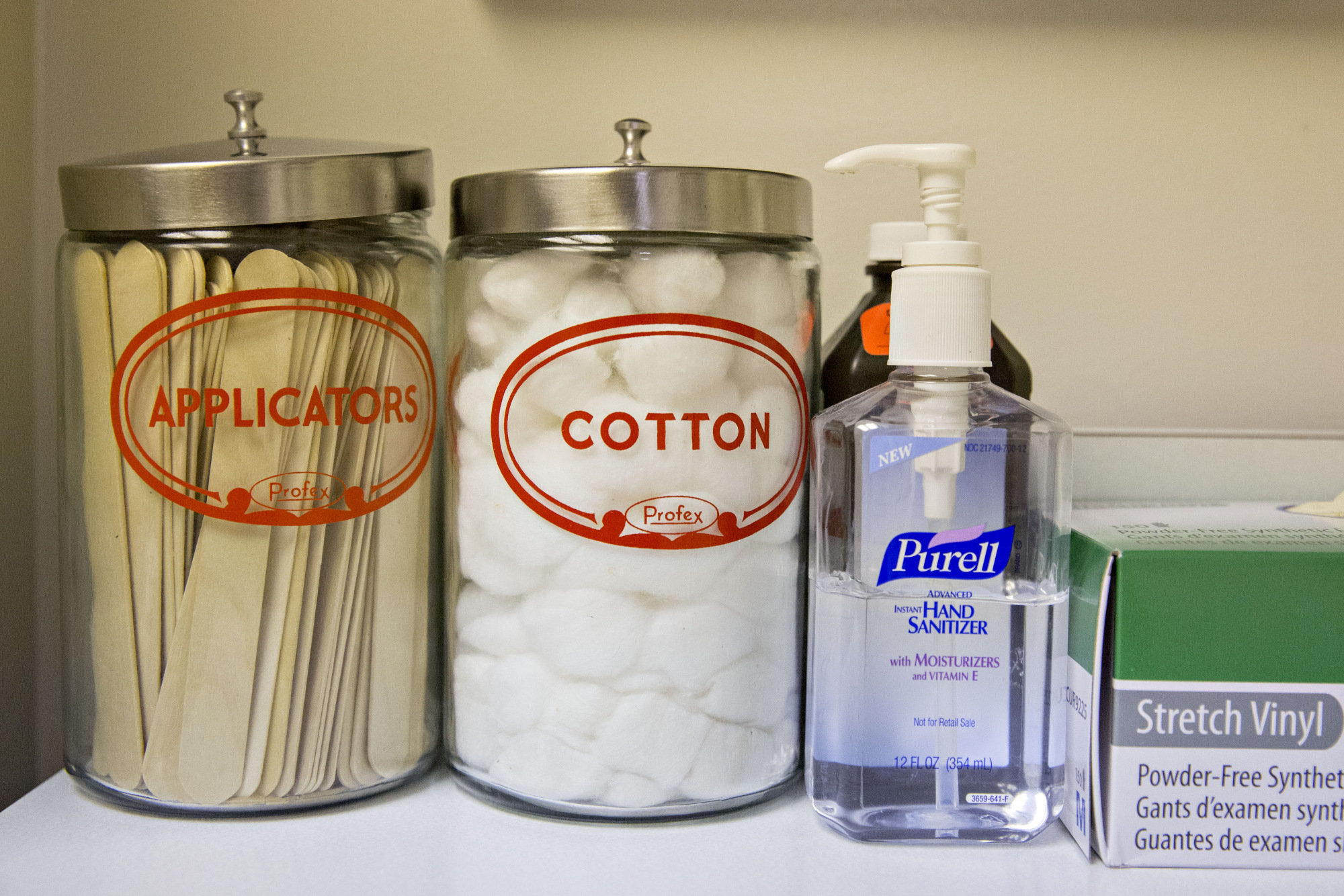 医疗用品摆放在伊利诺伊州普林斯顿市佩里纪念医院的检查室柜台上。