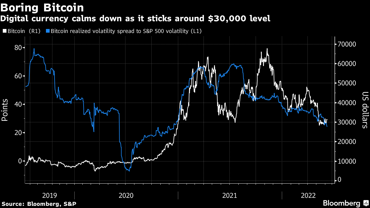比特币已经真正困在了3万美元左右的水平上,实现波动性向着在疫情期间达到的最低水平下降,相对于股票。其中一部分乏味之处在于这种虚拟货币在2022年几乎没有增长——它在年底附近达到了年初仅增长了3.5%。问题是,随着加息推升美元,比特币能否恢复活力。如果那个峰值保持不变,这将是自2014年以来比特币首次未能至少发布50%以上的年中激增。