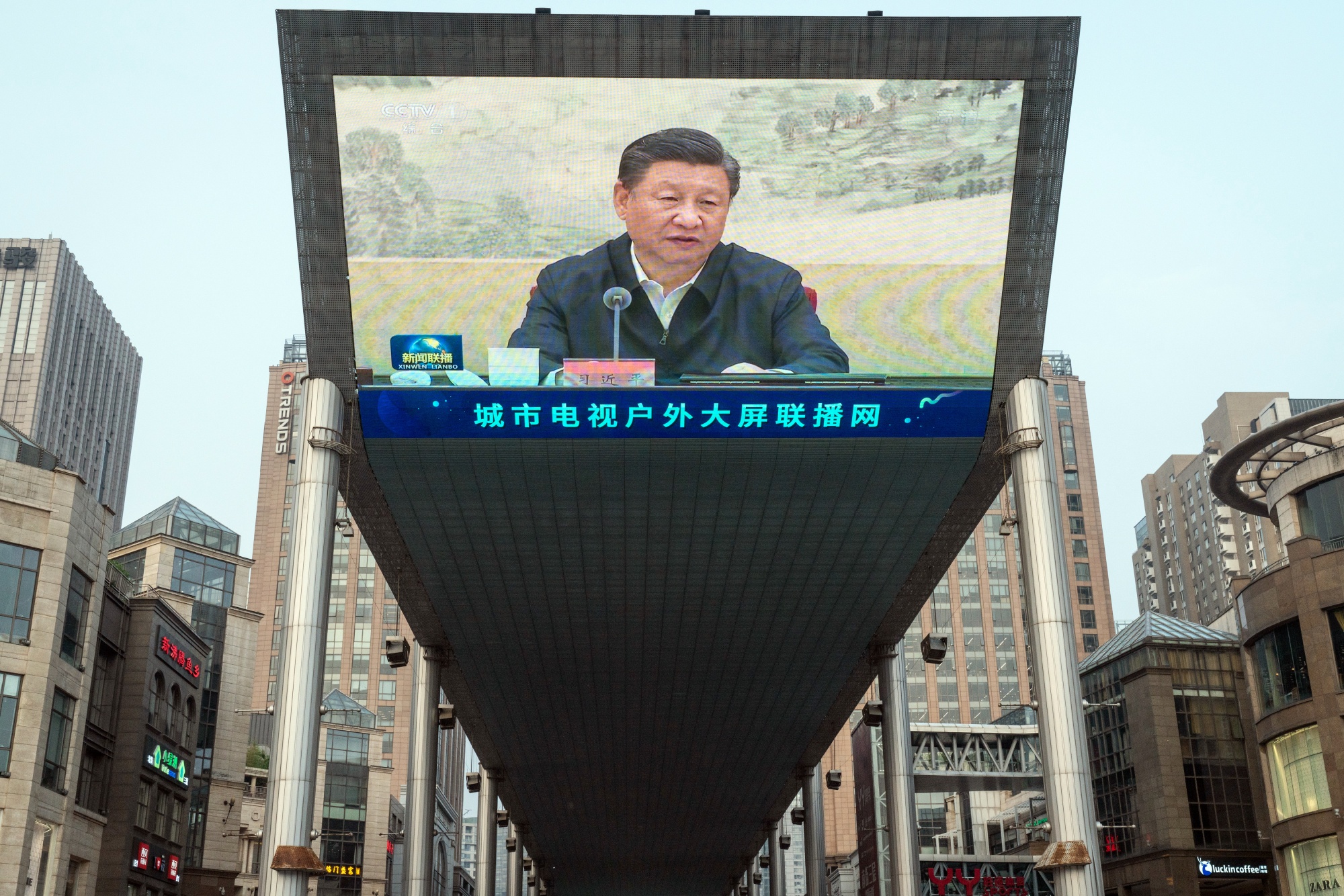 一块屏幕显示了中国国家主席习近平在北京的新闻广播。