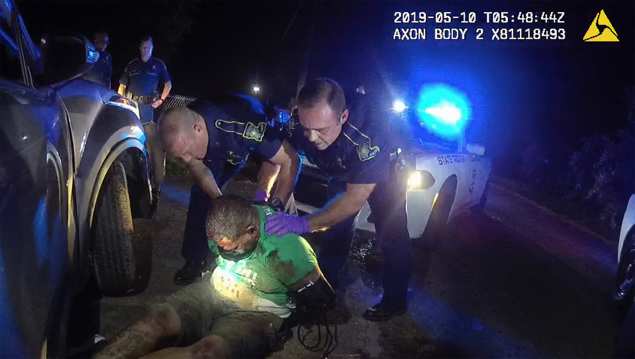 路易斯安那州警察特派员的一名身体摄像头图像显示,2019年5月,医护人员到达之前,警察们扶着罗纳德·格林。格林在被逮捕、电击和被州警察扼住脖子后死亡。