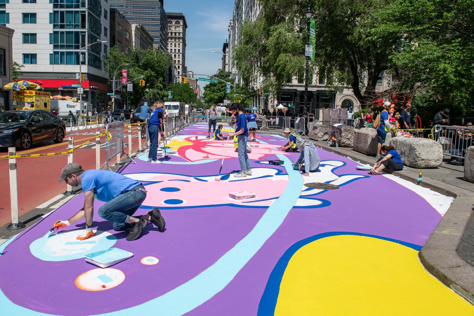 志愿者们正在绘制“涟漪的和平与宁静”壁画。摄影师:简·克拉托奇维尔/联合广场合作伙伴作为第14街公交专用道项目的一部分,联合广场合作伙伴的执行董事詹妮弗·福克表示,街道景观已经改变,以便在街道的北侧和南侧留出更窄的道路和额外的行人空间。第一幅壁画去年安装,传达了一个社会正义的信息,旨在引起人们对自2019年以来创造的额外行人空间的关注,并为社区使用增添吸引力。