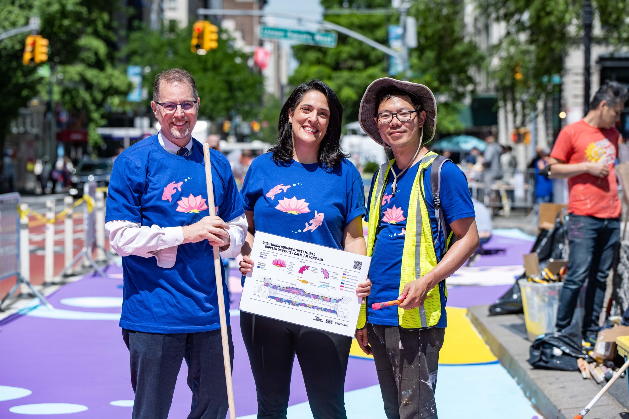 他的“涟漪和宁静”设计,由联合广场合作伙伴关系选中,现在装饰在百老汇和联合广场西之间的行人区,作为一幅象征着对抗困难的毅力的壁画。这幅艺术品上个月揭幕,其中盛开的莲花象征着亚裔美国社区——以及纽约人——在过去两年的疫情困境中正在崛起,Kim说。另一方面,壁画中的游动锦鲤代表着好运、繁荣和对更美好未来的希望。
