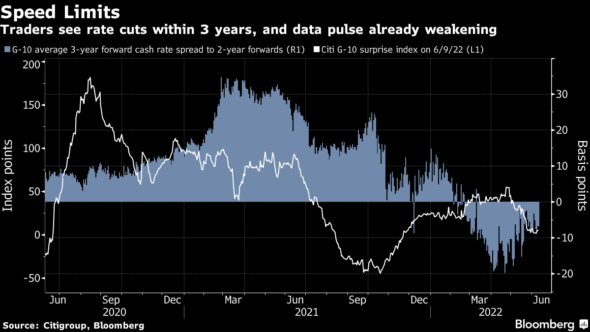 衰退的担忧再次困扰着股市,随着美国股市昨晚的尾盘下跌,标普500指数距离进入熊市只有一步之遥。至少在利率市场中,对经济前景的警报已经响了至少三个月,交易员们预示全球利率将在三年内下调,因为他们预计央行将加息到足以引发衰退的程度。