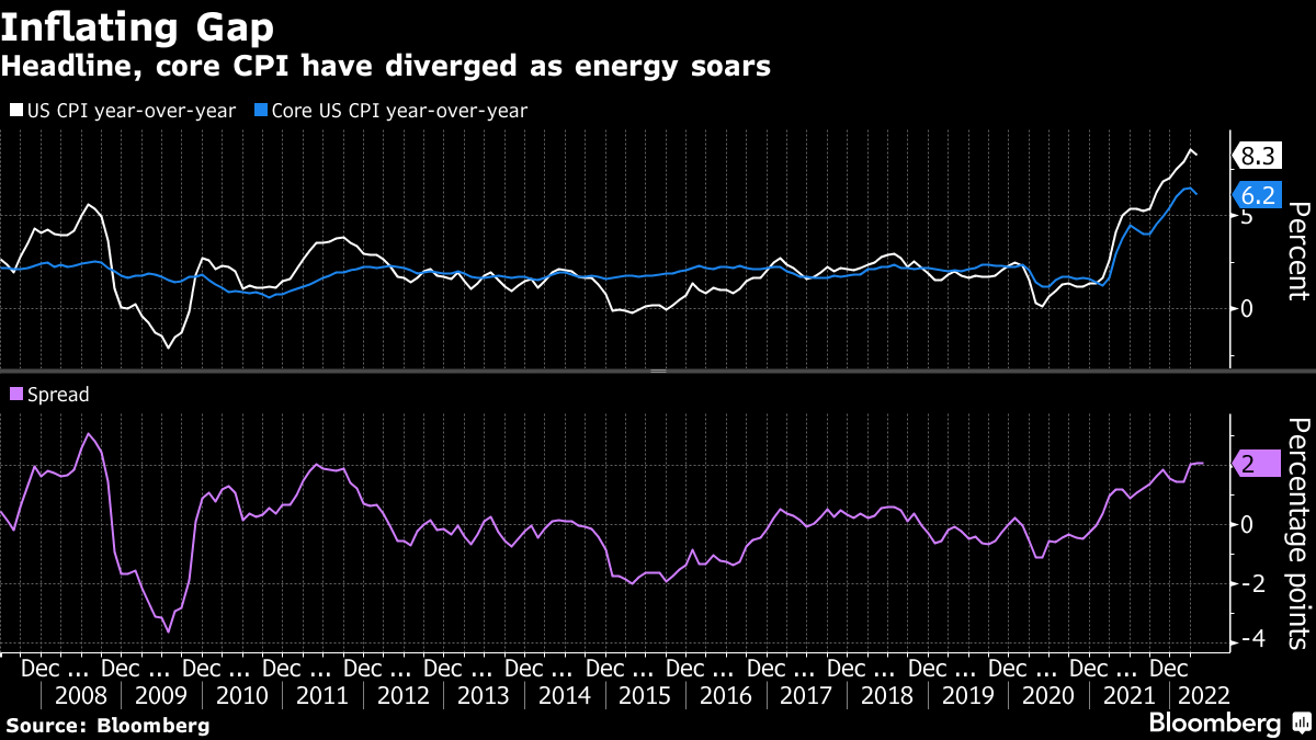 如果情况如此,两个指标之间的差距将扩大到2.4个百分点--自2008年底以来的最大差距。随着能源价格继续飙升,这个鸿沟只会变得更宽。本周,原油价格回升至每桶120美元以上,而美国的平均零售汽油价格距离每加仑5美元仅几分钱。