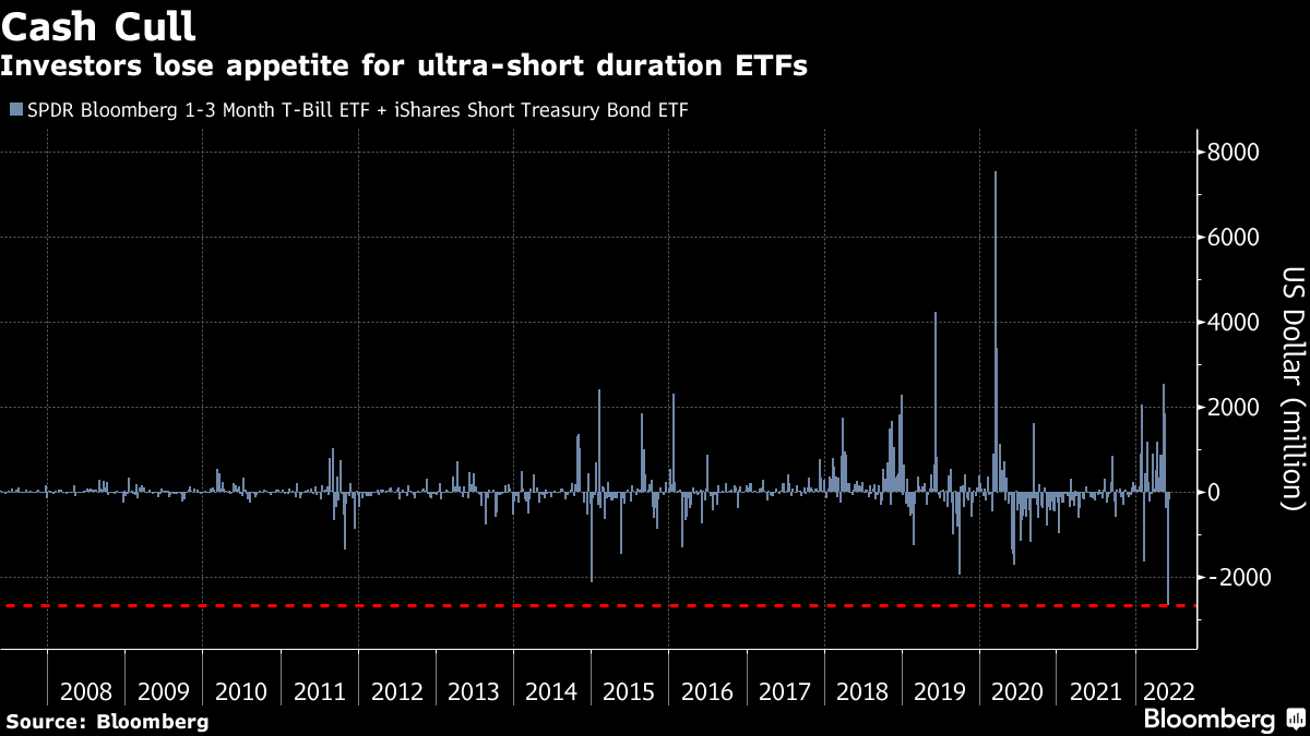 根据彭博社的丹尼莎·采科娃(Denitsa Tsekova)的记录,上周从总额为186亿美元的iShares短期国库券ETF(代码:SHV)和总额为175亿美元的SPDR彭博巴克莱1-3个月国库券ETF(BIL)中撤出了27亿美元,这是有史以来最大的资金流出,根据彭博社编制的数据。这一趋势仍在持续,截至周四,这两只基金的净流出仍在继续。