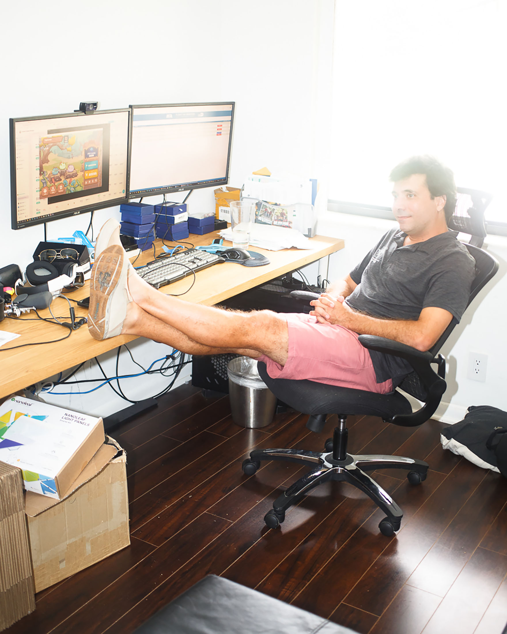 当我到达迈阿密时,阿门蒂亚告诉我,他的妻子对他的视频游戏业务持怀疑态度,最多只是允许他把在Reddit上认识的某个家伙带进家里。所以我们在下午的中途在一个购物中心的星巴克见面。阿门蒂亚戴着一顶棒球帽,穿着一件印有棕榈树图案的T恤。他有着两年来在一个包含幼儿的家里工作的人的胡须和疲惫的眼睛。我们点了咖啡,找到了靠近电源插座的座位,围坐在他的笔记本电脑旁。