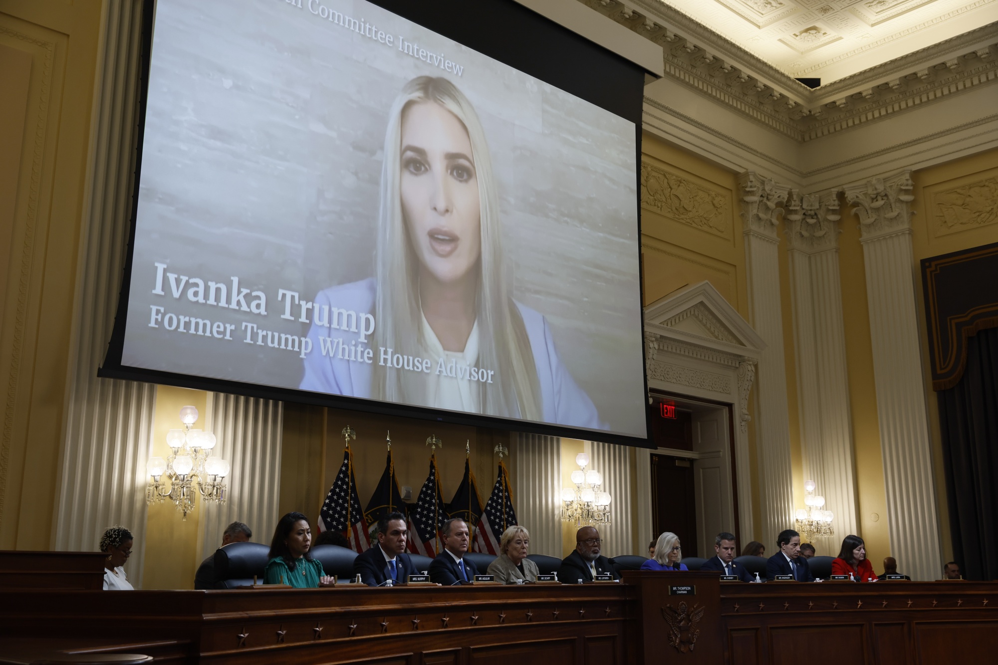 伊万卡·特朗普在一场1月6日袭击听证会中展示在屏幕上。