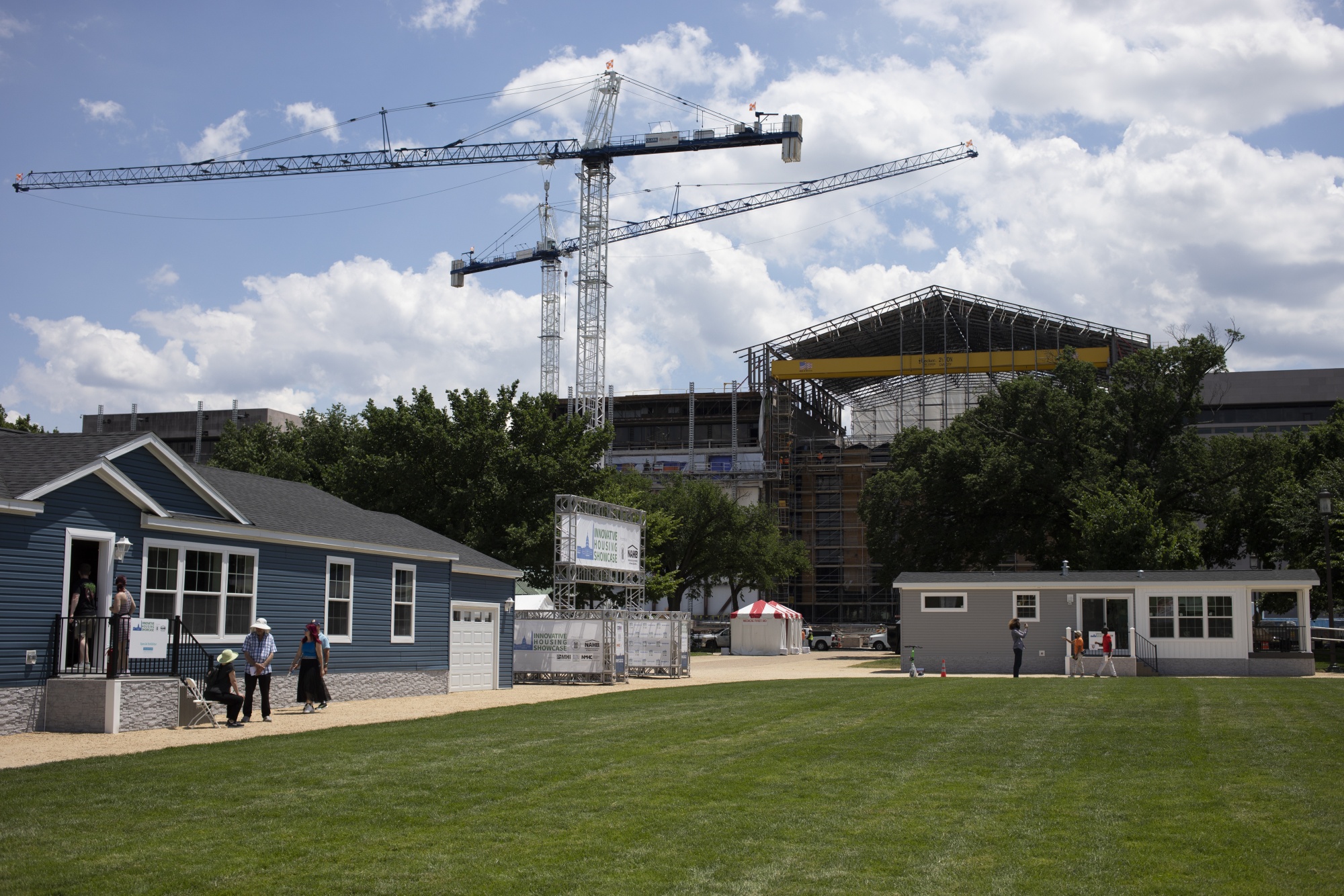 创新住房展示会上的一对样板房。一些单元在三天的节日前几个小时才在现场组装完成。摄影师:汤姆·布伦纳/彭博社美国住房和城市发展部与全国住宅建筑商协会联合制作,得到了制造房屋协会、全国多户住宅委员会和全国建筑博物馆的支持,在国家广场举办的活动传达了一个简单的信息:由于制造房屋可以大规模建造并在现场组装,它们代表了节约材料和劳动力成本的机会。例如,在国家广场上,一个两层房屋的框架在九个小时内建成,这个过程可能需要传统的“木结构”房屋建造商数周时间。赞助这栋房屋的行业团体——结构建筑部件协会和全国框架委员会,提供制造建筑部件的方式,以规避最近的木材冲击和工人短缺。