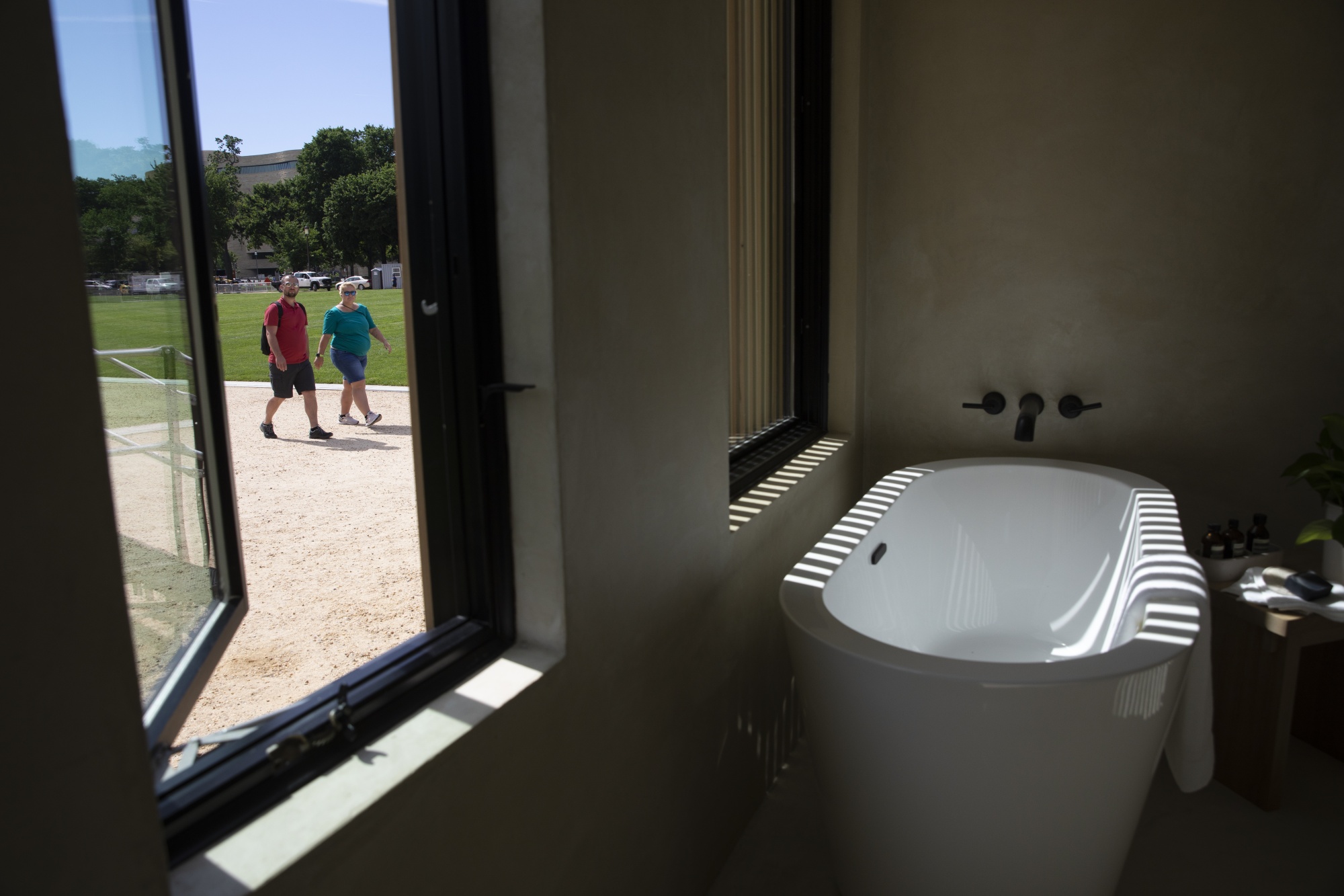 几栋示范房屋拥有高档设施,比如这个浸泡浴缸。摄影师:汤姆·布伦纳/彭博社节日的目标之一是揭开制造房屋领域的神秘面纱。
