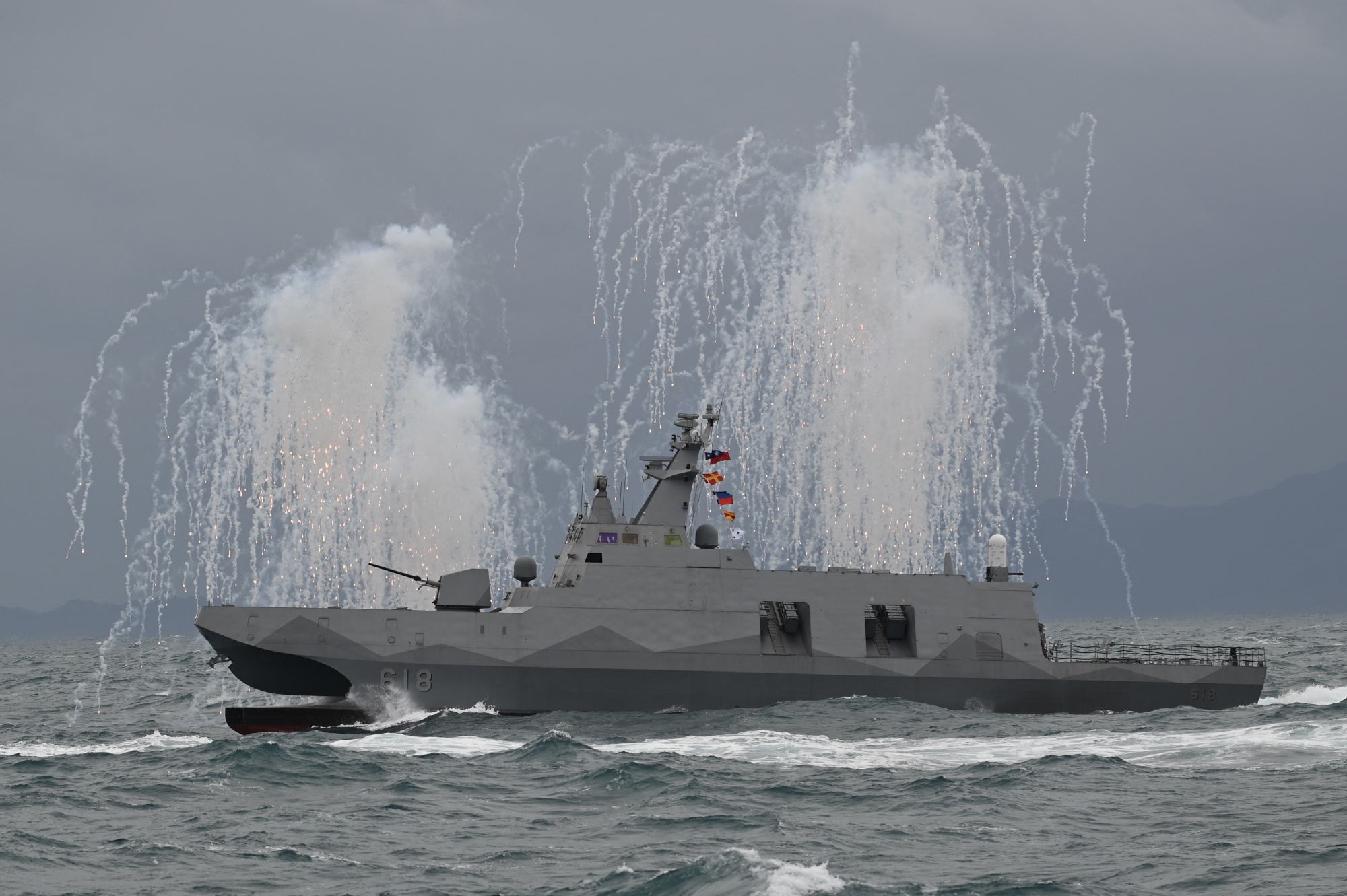 台湾国产的轻型护卫舰“大江”在演习中展示其战备状态。