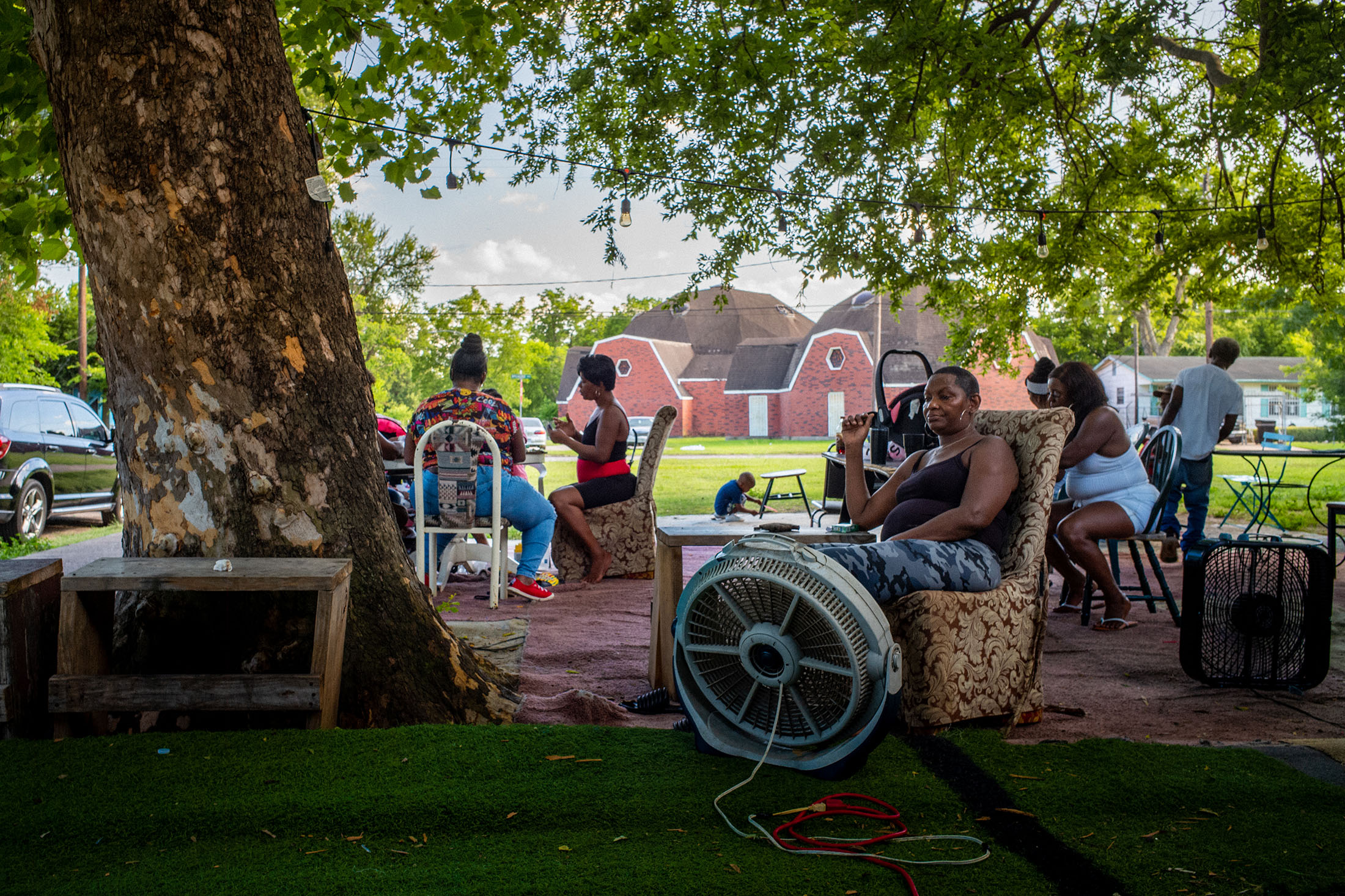 居民坐在得克萨斯州休斯顿一所房屋外的阴凉处,6月10日。