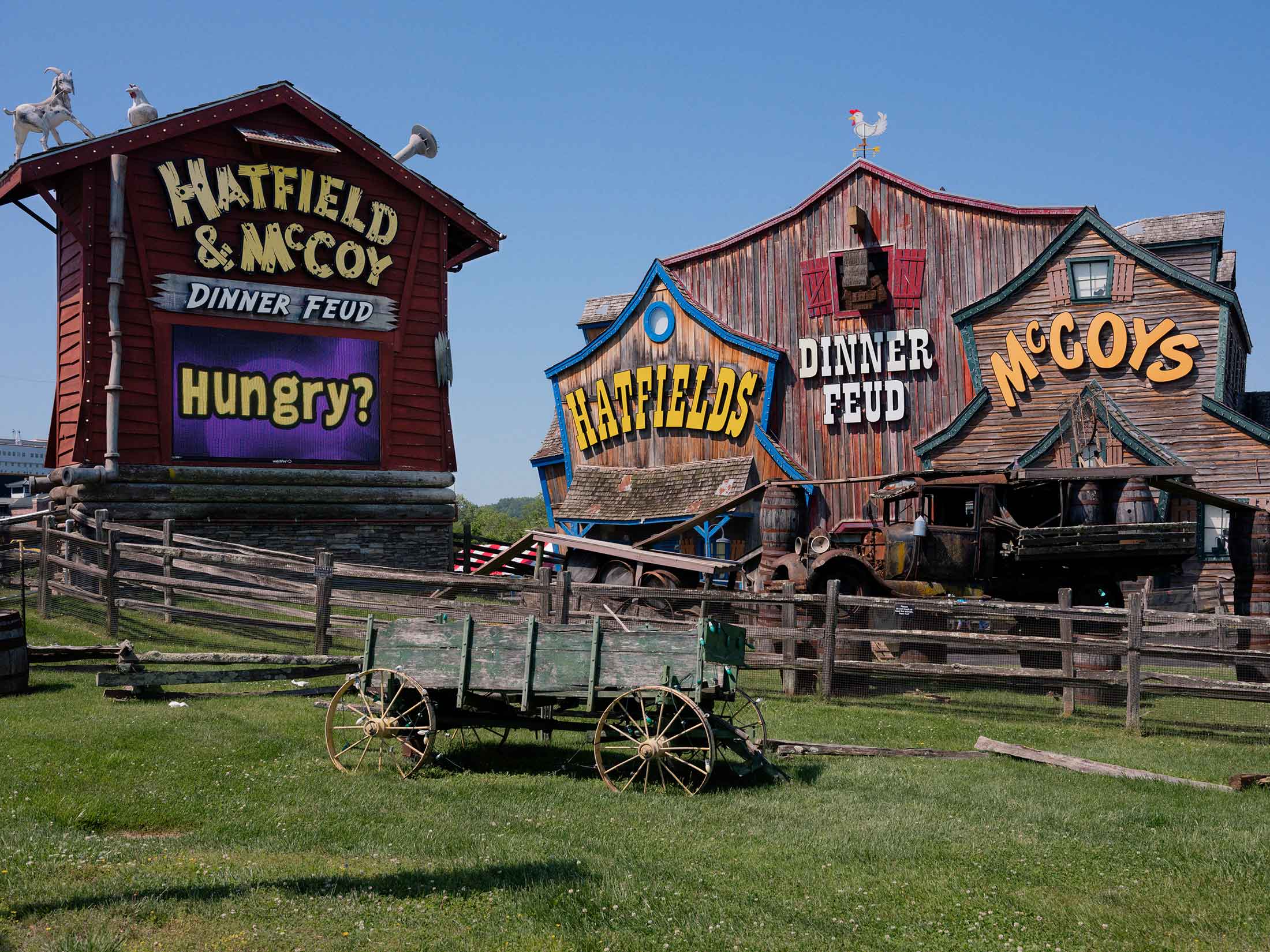 皮格恩福奇的哈特菲尔德与麦考伊晚宴表演。摄影师:塔玛拉·雷诺兹为彭博市场拍摄俗气的景点吸引着家庭。 皮格恩福奇有好莱坞蜡像馆,里面有巨大的金刚;哈特菲尔德与麦考伊晚宴,一个重现著名阿巴拉契亚家族冲突的礼堂(也是卡尔斯最赚钱的演唱工作场所);当然还有多利伍德,那里有老式燃煤蒸汽机车、惊人的飞象游乐设施,以及追逐彩虹博物馆的帕顿纪念品。