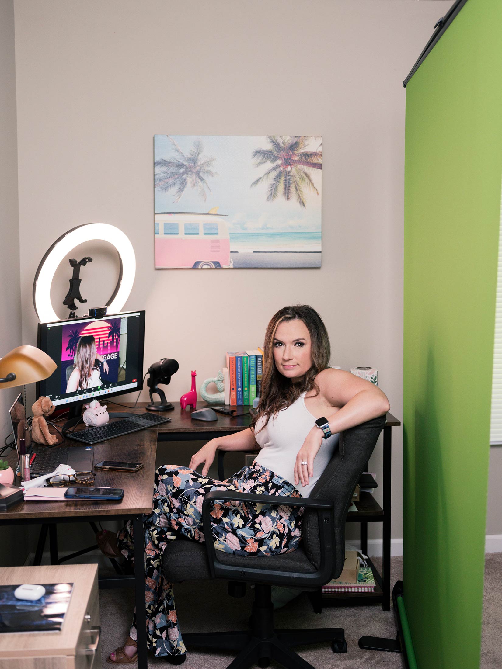 五月的一个周三上午,卡尔斯为大约30名潜在客户和员工主持了一个Zoom问答环节。她穿着牛仔裤和一件下摆系蝴蝶结的花衬衫,俯身靠近麦克风,一个环形灯照亮了她笔直的棕色头发,一个绿幕将她单调的背景变成了一个有棕榈树和升起太阳的海滩。