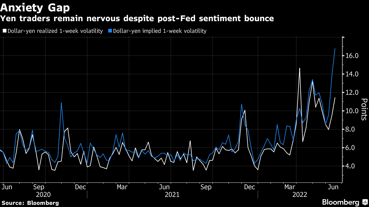 周三,日元兑美元跌至135.59的24年低点,随后在美联储宣布后与大多数主要货币一起反弹,交易接近134。尽管国内债券市场的严重动荡迫使日本央行加速其已经巨大的债券购买力度,但该货币在过去一周几乎没有变化。隐含波动率仍然如此之高,表明我们很可能会看到日元出现一些强劲波动,因为日本央行决定是坚持收益率曲线控制还是调整其立场。