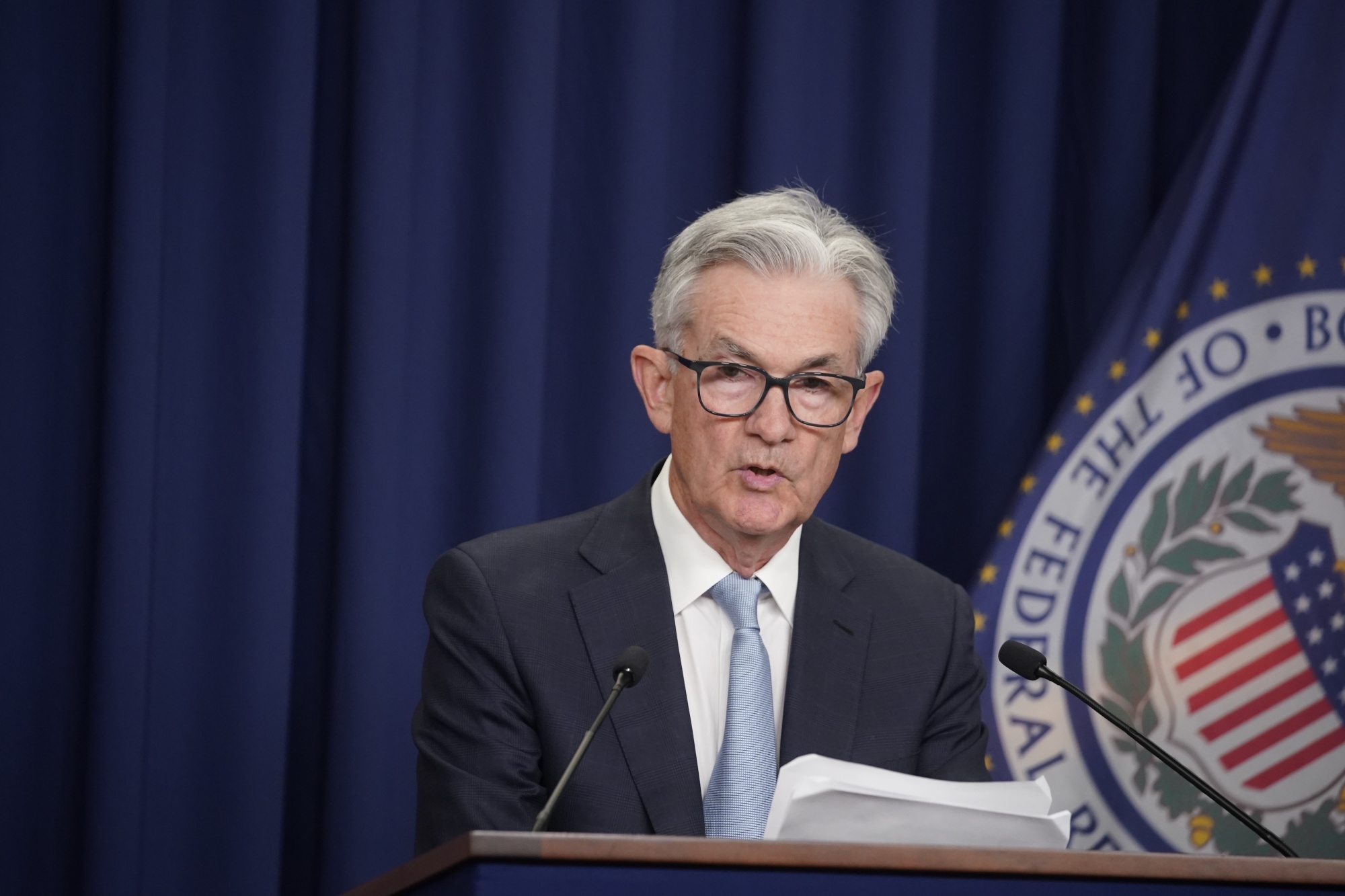 美国联邦储备委员会主席杰罗姆·鲍威尔在华盛顿周三举行的联邦公开市场委员会会议后举行新闻发布会。联邦储备委员会官员将主要利率上调了四分之三个百分点,并表示他们将在今年积极加息。