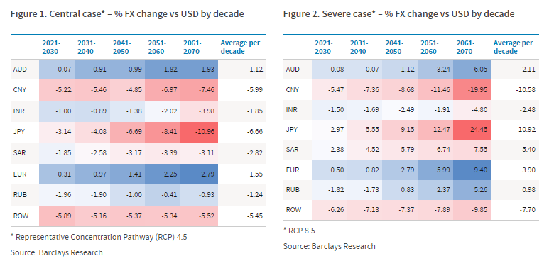 根据巴克莱经济学家详细描述的一种不利情景,气候变化可能导致日元和人民币在50年内贬值一半。
