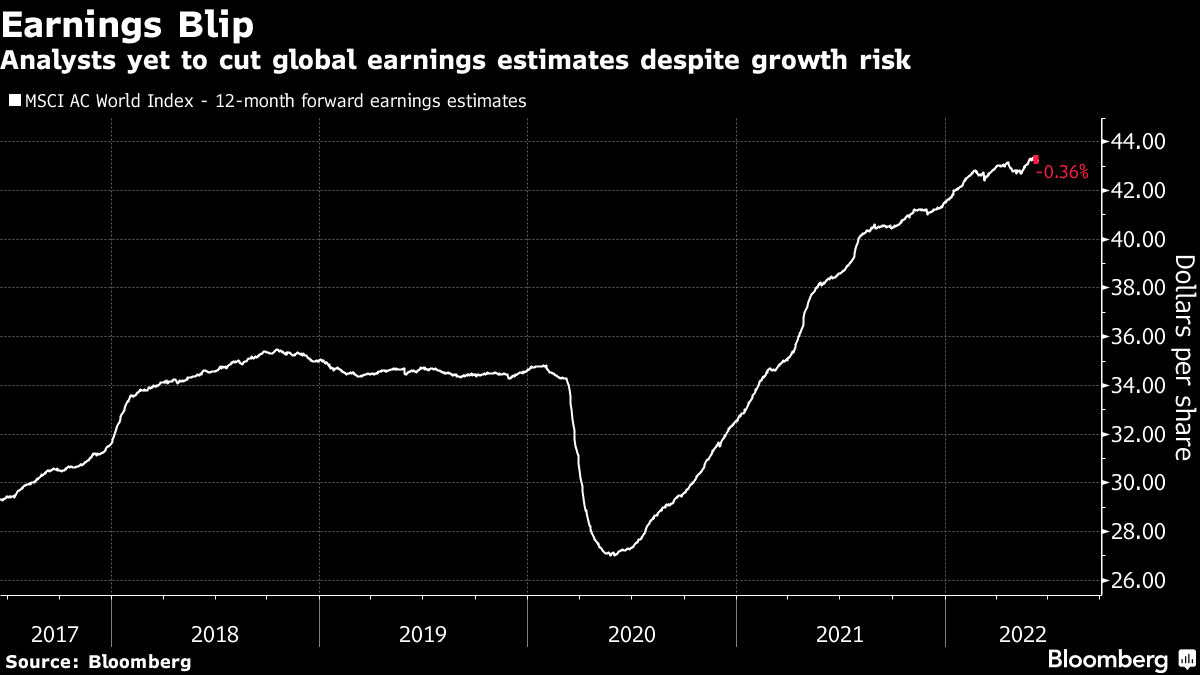 尽管鲍威尔警告称,由于美联储的激进加息,美国经济增长将放缓,失业率将上升。根据彭博经济学的最新估计,到2024年初,美国经济陷入衰退的概率接近四分之三。当美国经济打喷嚏时,世界其他地区都会感冒。这一点尚未计入全球利润预测中,应该会在这一点被计入之前继续对股票施加压力。