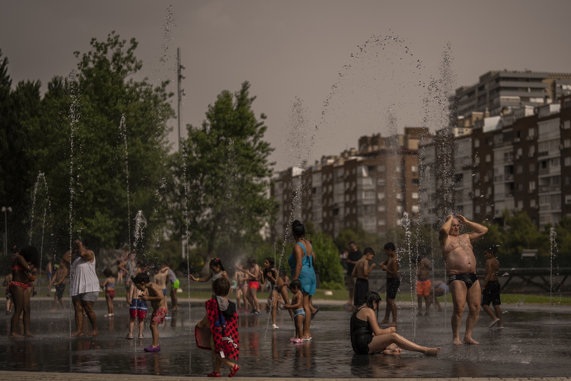 孩子和成年人在马德里的一座公园旁的河边的喷泉中消暑,西班牙,2022年6月15日星期三。西班牙气象部门表示,来自北非的热空气团正在引发该国今年首次大规模热浪,预计某些地区的气温将升至摄氏43度(华氏109度)。 (美联社照片/曼努·费尔南德斯)